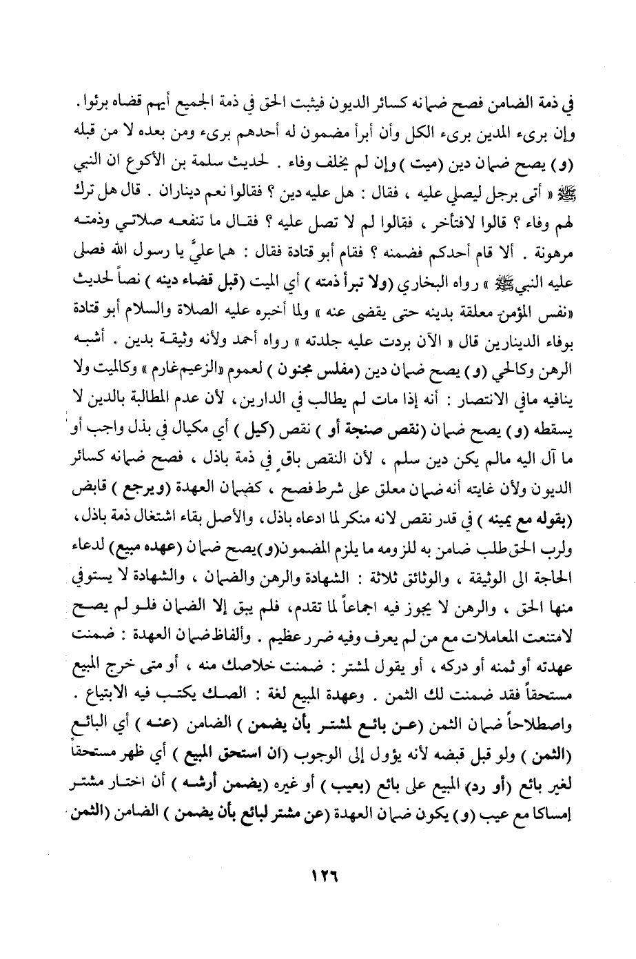 (وَ) يَصِحُّ ضَمَانُ (عُهْدَةِ مَبِيعٍ) لِدُعَاءِ الْحَاجَةِ إلَى الْوَثِيقَةِ، وَالْوَثَائِقُ ثَلَاثَةٌ: الشَّهَادَةُ وَالرَّهْنُ وَالضَّمَانُ، وَالشَّهَادَةُ لَا يُسْتَوْفَى مِنْهَا الْحَقُّ، وَالرَّهْنُ لَا يَجُوزُ فِيهِ إجْمَاعًا لِمَا تَقَدَّمَ، فَلَمْ يَبْقَ إلَّا الضَّمَانُ فَلَوْ لَمْ يَصِحَّ لَامْتَنَعَتْ الْمُعَامَلَاتُ مَعَ مَنْ لَمْ يَعْرِفْ وَفِيهِ ضَرَرٌ عَظِيمٌ وَأَلْفَاظُ ضَمَانِ الْعُهْدَةِ: ضَمِنْتُ عُهْدَتَهُ أَوْ ثَمَنَهُ أَوْ دَرَكَهُ، أَوْ يَقُولُ لِمُشْتَرٍ: ضَمِنْتُ خَلَاصَكَ مِنْهُ، أَوْ مَتَى خَرَجَ الْمَبِيعُ مُسْتَحَقًّا فَقَدْ ضَمِنْتُ لَك الثَّمَنَ وَعُهْدَةُ الْمَبِيعِ لُغَةً: الصَّكُّ يُكْتَبُ فِيهِ الِابْتِيَاعُ.
