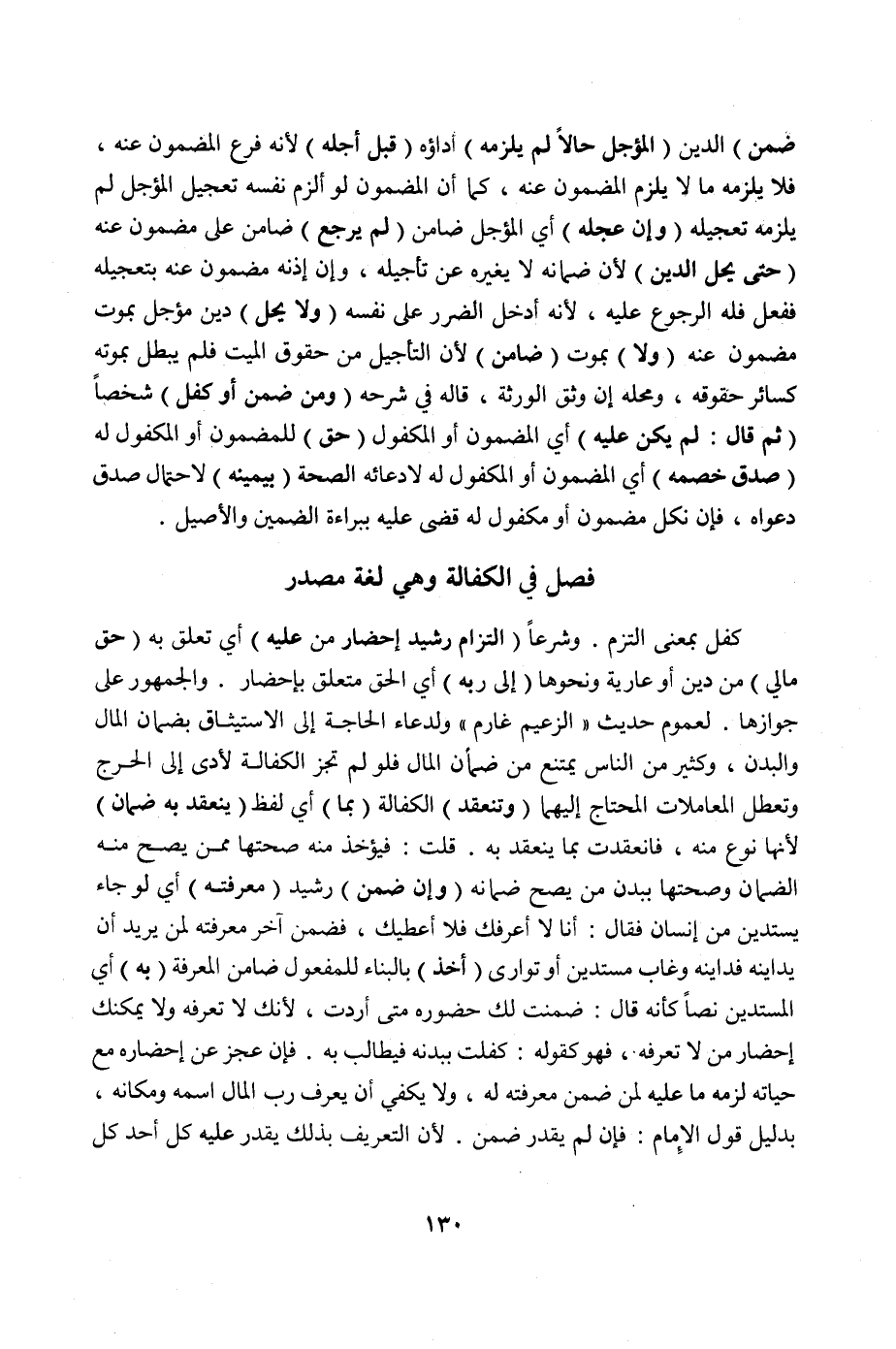 ِ وَهِيَ لُغَةً مَصْدَرُ كَفَلَ بِمَعْنَى الْتَزَمَ وَشَرْعًا (الْتِزَامُ رَشِيدٍ إحْضَارَ مَنْ عَلَيْهِ) أَيْ تَعَلَّقَ بِهِ (حَقٌّ مَالِيٌّ) مِنْ دَيْنٍ أَوْ عَارِيَّةٍ وَنَحْوِهَا (إلَى رَبِّهِ) أَيْ الْحَقِّ مُتَعَلِّقٌ بِإِحْضَارٍ وَالْجُمْهُورُ عَلَى جَوَازِهَا لِعُمُومِ حَدِيثِ «الزَّعِيمُ غَارِمٌ» وَلِدُعَاءِ الْحَاجَةِ إلَى الِاسْتِيثَاقِ بِضَمَانِ الْمَالِ وَالْبَدَنِ، وَكَثِيرٌ مِنْ النَّاسِ يَمْتَنِعُ مِنْ ضَمَانِ الْمَالِ فَلَوْ لَمْ تَجُزْ الْكَفَالَةُ لَأَدَّى إلَى الْحَرَجِ وَتَعَطُّلِ الْمُعَامَلَاتِ الْمُحْتَاجِ إلَيْهِمَا
