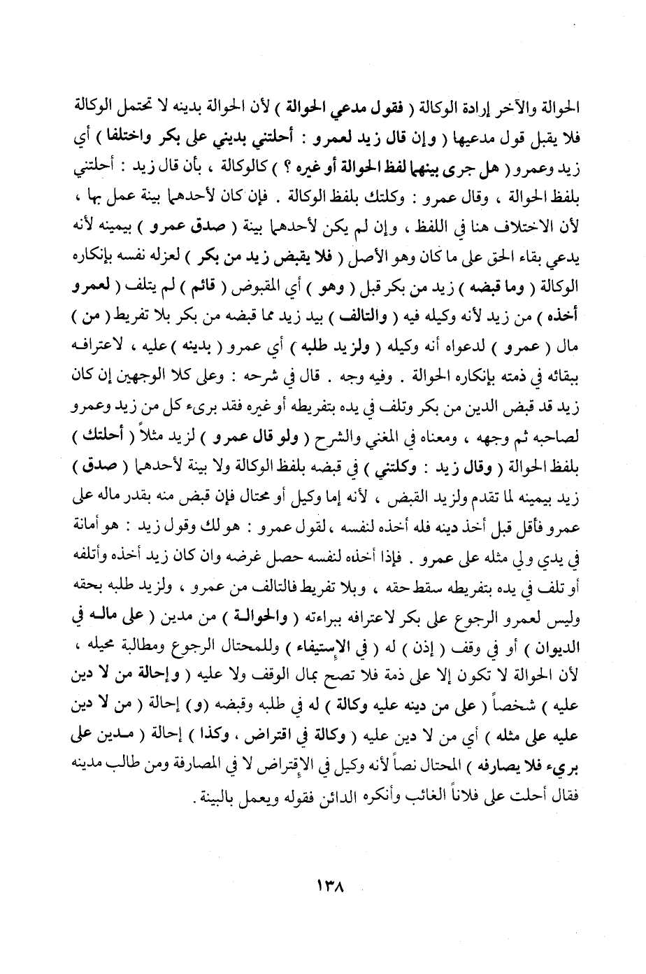 وَإِنْ لَمْ يَكُنْ لِأَحَدِهِمَا بَيِّنَةٌ (صُدِّقَ عَمْرٌو) بِيَمِينِهِ ; لِأَنَّهُ يَدَّعِي بَقَاءَ الْحَقِّ عَلَى مَا كَانَ وَهُوَ الْأَصْلُ (فَلَا يَقْبِضُ زَيْدٌ مِنْ بَكْرٍ) لِعَزْلِ نَفْسِهِ بِإِنْكَارِهِ الْوَكَالَةَ (وَمَا قَبَضَهُ) زَيْدٌ مِنْ بَكْرٍ قَبْلُ (وَهُوَ) أَيْ الْمَقْبُوضُ (قَائِمٌ) لَمْ يَتْلَفْ (لِعَمْرٍو أَخْذُهُ) مِنْ زَيْدٍ ; لِأَنَّهُ وَكِيلُهُ فِيهِ (وَالتَّالِفُ) بِيَدِ زَيْدٍ مِمَّا قَبَضَهُ مِنْ بَكْرٍ بِلَا تَفْرِيطٍ (مِنْ) مَالِ (عَمْرٍو) لِدَعْوَاهُ أَنَّهُ وَكِيلُهُ (وَلِزَيْدٍ طَلَبُهُ) أَيْ عَمْرٍو (بِدَيْنِهِ) عَلَيْهِ، لِاعْتِرَافِهِ بِبَقَائِهِ فِي ذِمَّتِهِ بِإِنْكَارِهِ الْحَوَالَةَ، وَفِيهِ وَجْهٌ قَالَ فِي شَرْحِهِ: وَعَلَى كِلَا الْوَجْهَيْنِ إنْ كَانَ زَيْدٌ قَدْ قَبَضَ الدَّيْنَ مِنْ بَكْرٍ وَتَلِفَ فِي يَدِهِ بِتَفْرِيطِهِ أَوْ غَيْرِهِ فَقَدْ بَرِئَ كُلٌّ مِنْ زَيْدٍ وَعَمْرٍو لِصَاحِبِهِ ثُمَّ وَجَّهَهُ، وَمَعْنَاهُ فِي الْمُغْنِي وَالشَّرْحِ
