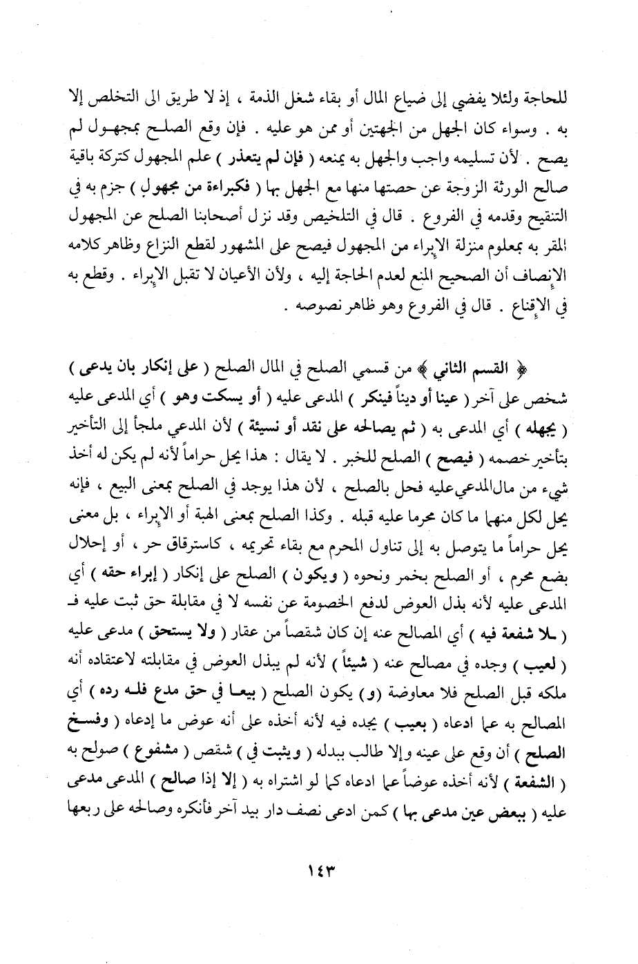 (الْقِسْمُ الثَّانِي) مِنْ قِسْمَيْ الصُّلْحِ فِي الْمَالِ، الصُّلْحُ (عَلَى إنْكَارٍ بِأَنْ يَدَّعِيَ) شَخْصٌ عَلَى آخَرَ (عَيْنًا أَوْ دَيْنًا فَيُنْكِرَ) الْمُدَّعَى عَلَيْهِ (أَوْ يَسْكُتَ وَهُوَ) أَيْ الْمُدَّعَى عَلَيْهِ (يَجْهَلُهُ) أَيْ الْمُدَّعَى بِهِ (ثُمَّ يُصَالِحَهُ عَلَى نَقْدٍ أَوْ نَسِيئَةٍ) ; لِأَنَّ الْمُدَّعِيَ مُلْجَأٌ إلَى التَّأْخِيرِ بِتَأْخِيرِ خَصْمِهِ (فَيَصِحُّ) الصُّلْحُ لِلْخَيْرِ. لَا يُقَالُ: هَذَا يُحِلُّ حَرَامًا ; لِأَنَّهُ لَمْ يَكُنْ لَهُ أَخْذُ شَيْءٍ مِنْ مَالِ الْمُدَّعَى عَلَيْهِ فَحَلَّ بِالصُّلْحِ ; لِأَنَّ هَذَا يُوجَدُ فِي الصُّلْحِ بِمَعْنَى الْبَيْعِ، فَإِنَّهُ يَحِلُّ لِكُلٍّ مِنْهُمَا مَا كَانَ مُحَرَّمًا عَلَيْهِ قَبْلَهُ وَكَذَا الصُّلْحُ بِمَعْنَى الْهِبَةِ أَوْ الْإِبْرَاءِ، بَلْ مَعْنَى يُحِلُّ حَرَامًا مَا يُتَوَصَّلُ بِهِ إلَى تَنَاوُلِ الْمُحَرَّمِ مَعَ بَقَاءِ تَحْرِيمِهِ، كَاسْتِرْقَاقِ حُرٍّ، أَوْ إحْلَالِ بُضْعٍ مُحَرَّمٍ، أَوْ الصُّلْحِ بِخَمْرٍ وَنَحْوِهِ (وَيَكُونُ) الصُّلْحُ عَلَى إنْكَارِ (إبْرَاءِ حَقِّهِ) أَيْ الْمُدَّعَى عَلَيْهِ ; لِأَنَّهُ بَذْلُ الْعِوَضِ لِدَفْعِ الْخُصُومَةِ عَنْ نَفْسِهِ لَا فِي مُقَابَلَةِ حَقٍّ ثَبَتَ عَلَيْهِ فَ (لَا شُفْعَةَ فِيهِ) أَيْ الْمُصَالَحِ عَنْهُ إنْ كَانَ شِقْصًا مِنْ عَقَارٍ.