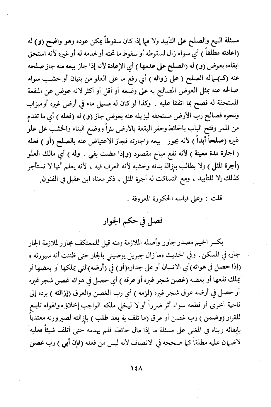 وَفِي الْحَدِيثِ «مَا زَالَ جِبْرِيلُ يُوصِينِي بِالْجَارِ حَتَّى ظَنَنْتُ أَنَّهُ سَيُوَرِّثُهُ» (إذَا حَصَلَ فِي هَوَائِهِ) أَيْ الْإِنْسَانِ أَوْ عَلَى جِدَارِهِ (أَوْ) فِي (أَرْضِهِ) الَّتِي يَمْلِكُهَا أَوْ بَعْضِهَا أَوْ يَمْلِكُ نَفْعَهَا أَوْ بَعْضَهُ (غُصْنُ شَجَرِ غَيْرِهِ أَوْ عِرْقُهُ) أَيْ حَصَلَ فِي هَوَائِهِ غُصْنُ شَجَرِ غَيْرِهِ أَوْ حَصَلَ فِي أَرْضِهِ عِرْقُ شَجَرِ غَيْرِهِ (لَزِمَهُ) أَيْ رَبَّ الْغُصْنِ وَالْعِرْقِ (إزَالَتُهُ) بِرَدِّهِ إلَى نَاحِيَةٍ أُخْرَى أَوْ قَطْعُهُ سَوَاءٌ أَثَّرَ ضَرَرًا أَوْ لَا لِيُخَلِّيَ مِلْكَهُ الْوَاجِبَ إخْلَاؤُهُ وَالْهَوَاءُ تَابِعٌ لِلْقَرَارِ.