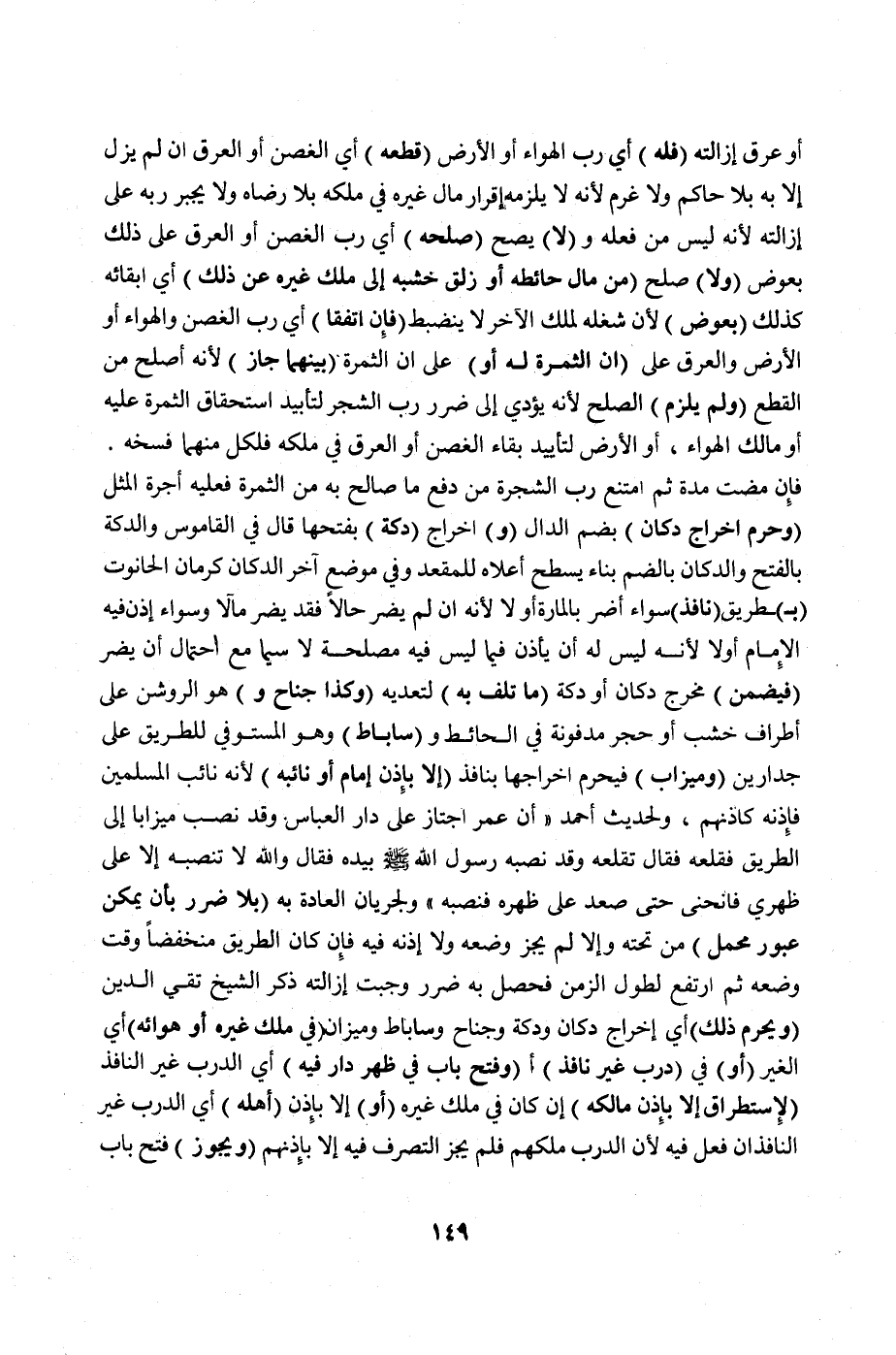 وَفِي مَوْضِعٌ آخَرَ الدُّكَّانُ كَرُّمَّانٍ الْحَانُوتُ (بِ) طَرِيقٍ (نَافِذٍ) سَوَاءٌ أَضَرَّ بِالْمَارَّةِ أَوْ لَا ; لِأَنَّهُ إنْ لَمْ يَضُرَّ حَالًا فَقَدْ يَضُرُّ مَآلًا وَسَوَاءٌ أَذِنَ فِيهِ الْإِمَامُ أَوْ لَا ; لِأَنَّهُ لَيْسَ لَهُ أَنْ يَأْذَنَ فِيمَا لَيْسَ فِيهِ مَصْلَحَةٌ لَا سِيَّمَا مَعَ احْتِمَالِ أَنْ يَضُرَّ (فَيَضْمَنُ) مَخْرَجَ دُكَّانٍ أَوْ دَكَّةٍ (مَا تَلِفَ بِهِ) لِتَعَدِّيهِ