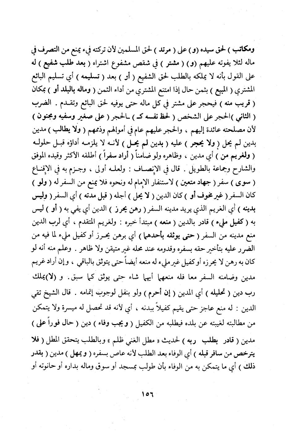 وَمُكَاتَبٍ) لِحَقِّ سَيِّدِهِ (وَ) عَلَى (مُرْتَدٍّ) لِحَقِّ الْمُسْلِمِينَ ; لِأَنَّ تَرِكَتَهُ فَيْءٌ يُمْنَعُ مِنْ التَّصَرُّفِ فِي مَالِهِ لِئَلَّا يُفَوِّتَهُ عَلَيْهِمْ (وَ) (مُشْتَرٍ) فِي شِقْصٍ مَشْفُوعٍ اشْتَرَاهُ (بَعْدَ طَلَبِ شَفِيعٍ) لَهُ عَلَى الْقَوْلِ بِأَنَّهُ لَا يَمْلِكُهُ بِالطَّلَبِ لِحَقِّ الشَّفِيعِ (أَوْ) بَعْدَ (تَسْلِيمِهِ) أَيْ تَسْلِيمِ الْبَائِعِ الْمُشْتَرِيَ (الْمَبِيعَ) بِثَمَنٍ حَالٍّ إذَا امْتَنَعَ الْمُشْتَرِي مِنْ أَدَاءِ الثَّمَنِ (وَمَالُهُ بِالْبَلَدِ أَوْ) بِمَكَانٍ (قَرِيبٍ مِنْهُ) فَيُحْجَرُ عَلَى مُشْتَرٍ فِي كُلِّ مَالِهِ حَتَّى يُوَفِّيَهُ لِحَقِّ الْبَائِعِ وَتَقَدَّمَ