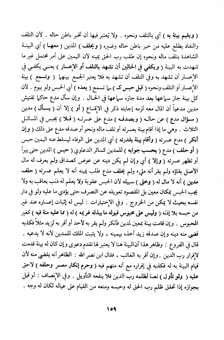 (وَيَحْلِفُ) الْمَدِينُ (مَعَهَا) أَيْ الْبَيِّنَةِ الشَّاهِدَةِ بِتَلَفِ مَالِهِ وَنَحْوِهِ إنْ طَلَبَ رَبُّ الْحَقِّ يَمِينَهُ ; لِأَنَّ الْيَمِينَ عَلَى أَمْرٍ مُحْتَمَلٍ غَيْرِ مَا شَهِدَتْ بِهِ الْبَيِّنَةُ (وَيَكْفِي فِي الْحَالَيْنِ أَنْ تَشْهَدَ بِالتَّلَفِ أَوْ الْإِعْسَارِ) يَعْنِي يَكْفِي فِي الْإِعْسَارِ أَنْ تَشْهَدَ بِهِ وَفِي التَّلَفِ أَنْ تَشْهَدَ بِهِ فَلَا يُعْتَبَرُ الْجَمْعُ بَيْنَهُمَا (وَتُسْمَعُ) بَيِّنَةُ الْإِعْسَارِ أَوْ التَّلَفِ وَنَحْوِهِ (قَبْلَ حَبْسٍ ك) مَا تُسْمَعُ (بَعْدَهُ) أَيْ الْحَبْسِ وَلَوْ بِيَوْمٍ ; لِأَنَّ كُلَّ بَيِّنَةٍ جَازَ سَمَاعُهَا بَعْدَ مُدَّةٍ جَازَ سَمَاعُهَا فِي الْحَالِ وَإِنْ سَأَلَ مُدَّعٍ حَاكِمًا تَفْتِيشَ مَدِينٍ مُدَّعِيًا أَنَّ الْمَالَ مَعَهُ لَزِمَهُ إجَابَتُهُ ذُكِرَ فِي الْإِقْنَاعِ (أَوْ) إلَّا أَنْ (يَسْأَلَ) مَدِينٌ (سُؤَالَ مُدَّعٍ) عَنْ حَالِهِ (وَيُصَدِّقُهُ) مُدَّعٍ عَلَى عُسْرَتِهِ (فَلَا) يُحْبَسُ فِي الْمَسَائِلِ الثَّلَاثِ وَهِيَ مَا إذَا أَقَامَ بَيِّنَةً بِعُسْرَتِهِ أَوْ تَلَفِ مَالِهِ وَنَحْوِهِ أَوْ صَدَّقَهُ مُدَّعٍ عَلَى ذَلِكَ.