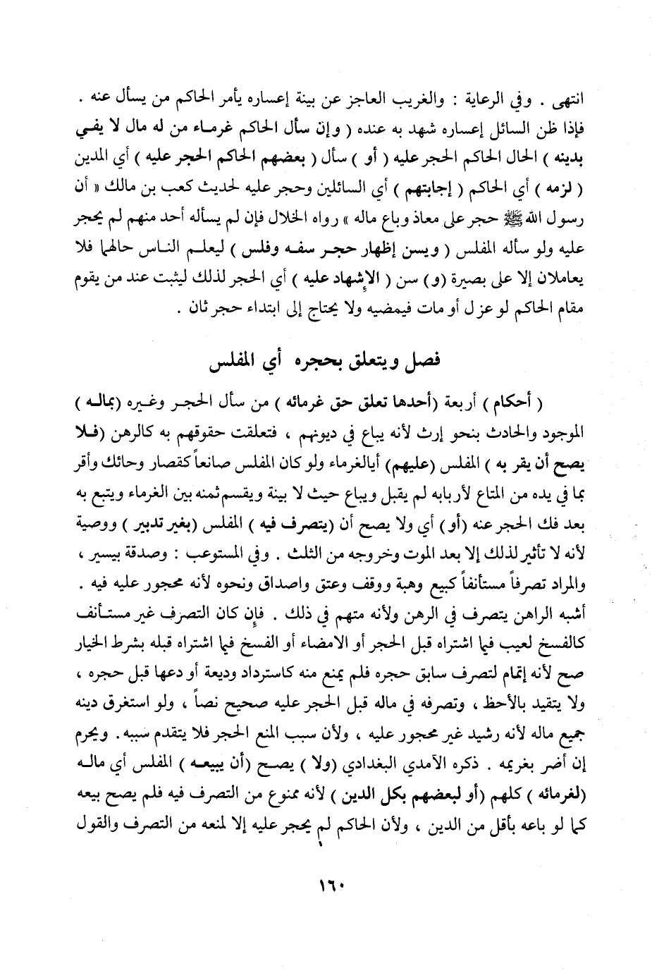 فَصْلٌ: وَيَتَعَلَّقُ بِحَجْرِهِ أَيْ الْمُفْلِسِ (أَحْكَامٌ) أَرْبَعَةٌ (أَحَدُهَا تَعَلُّقُ حَقِّ غُرَمَائِهِ) مَنْ سَأَلَ الْحَجْرَ وَغَيْرُهُ (بِمَالِهِ) الْمَوْجُودِ وَالْحَادِثِ بِنَحْوِ إرْثٍ ; لِأَنَّهُ يُبَاعُ فِي دُيُونِهِمْ، فَتَعَلَّقَتْ حُقُوقُهُمْ بِهِ كَالرَّهْنِ (فَلَا يَصِحُّ أَنْ يُقِرَّ بِهِ) الْمُفْلِسُ (عَلَيْهِمْ) أَيْ الْغُرَمَاءِ وَلَوْ كَانَ الْمُفْلِسُ صَانِعًا كَقَصَّارٍ وَحَائِكٍ وَأَقَرَّ بِمَا فِي يَدِهِ مِنْ الْمَتَاعِ لِأَرْبَابِهِ لَمْ يُقْبَلْ وَيُبَاعُ حَيْثُ لَا بَيِّنَةَ وَيُقْسَمُ ثَمَنُهُ بَيْنَ الْغُرَمَاءِ وَيُتْبَعُ بِهِ بَعْدَ فَكِّ الْحَجْرِ عَنْهُ (أَوْ) أَيْ وَلَا يَصِحُّ أَنْ (يَتَصَرَّفَ فِيهِ) الْمُفْلِسُ (بِغَيْرِ تَدْبِيرٍ) وَوَصِيَّةٍ ; لِأَنَّهُ لَا تَأْثِيرَ لِذَلِكَ إلَّا بَعْدَ الْمَوْتِ وَخُرُوجُهُ مِنْ الثُّلُثِ وَفِي الْمُسْتَوْعِبِ: وَصَدَقَةٍ بِيَسِيرٍ.