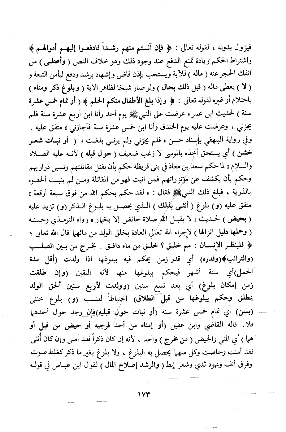 (وَ) بُلُوغِ خُنْثَى (بِسِنٍّ) أَيْ تَمَامِ خَمْسَ عَشْرَةَ سَنَةً (أَوْ نَبَاتٍ حَوْلَ قُبُلَيْهِ) فَإِنْ وُجِدَ حَوْلَ أَحَدِهِمَا فَلَا، قَالَهُ الْقَاضِي وَابْنُ عَقِيلٍ (أَوْ إمْنَاءٍ مِنْ أَحَدِ فَرْجَيْهِ أَوْ حَيْضٍ مِنْ قُبُلٍ أَوْ هُمَا) أَيْ الْمَنِيُّ وَالْحَيْضُ (مِنْ مَخْرَجٍ) وَاحِدٍ ; لِأَنَّهُ إنْ كَانَ ذَكَرًا فَقَدْ أَمْنَى وَإِنْ كَانَ أُنْثَى فَقَدْ أَمْنَتْ وَحَاضَتْ وَكُلٌّ مِنْهُمَا يَحْصُلُ بِهِ الْبُلُوغُ، وَلَا بُلُوغَ بِغَيْرِ مَا ذُكِرَ كَغِلَظِ صَوْتٍ وَفَرْقِ أَنْفٍ وَنُهُودِ ثَدْيٍ وَشَعْرِ إبِطٍ (وَالرُّشْدُ إصْلَاحُ الْمَالِ) لِقَوْلِ ابْنِ عَبَّاسٍ فِي