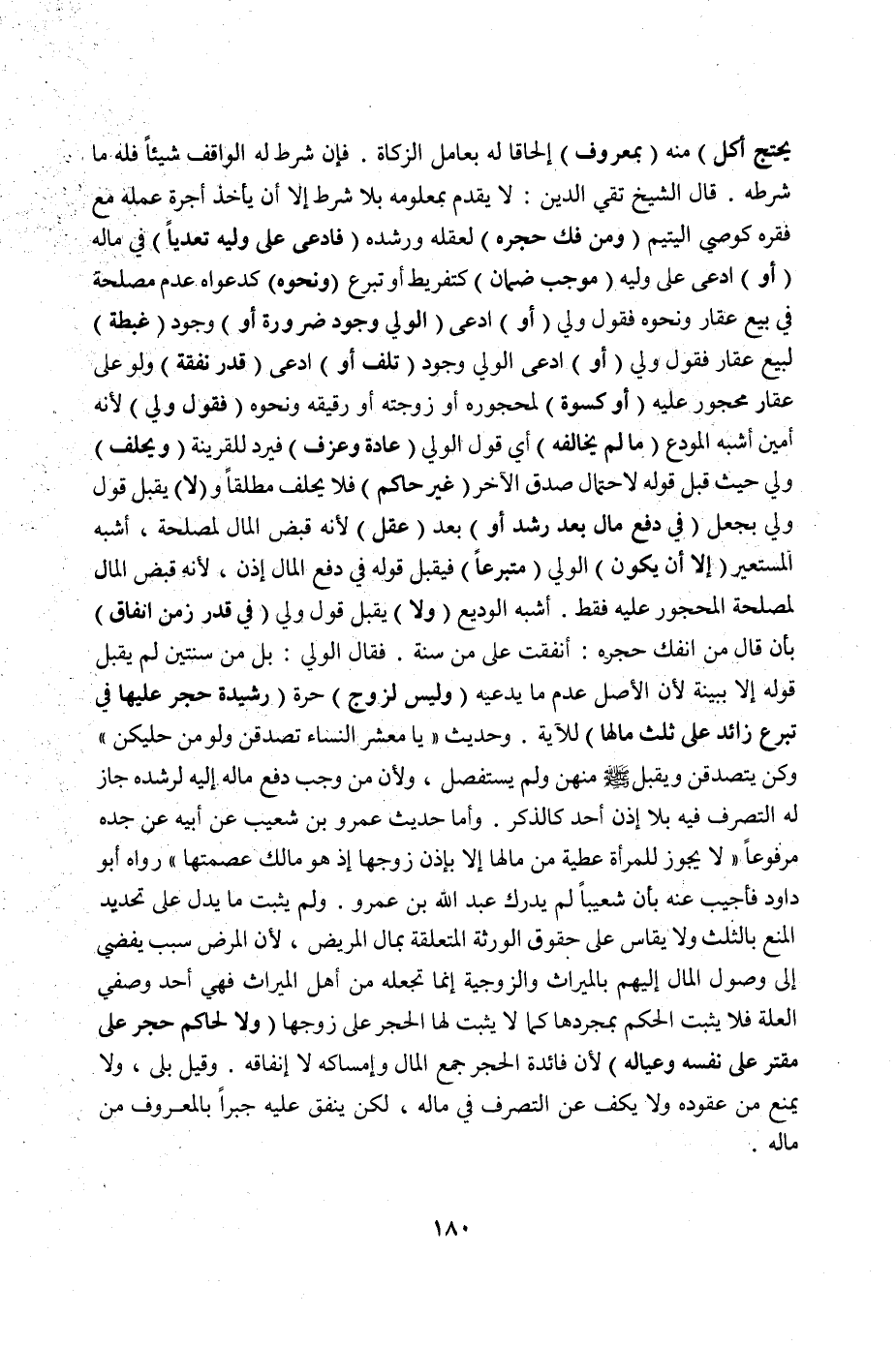 (وَمَنْ فُكَّ حَجْرُهُ) لِعَقْلِهِ وَرُشْدِهِ (فَادَّعَى عَلَى وَلِيُّهُ تَعَدِّيًا) فِي مَالِهِ (أَوْ) ادَّعَى عَلَى وَلِيُّهُ (مُوجِبَ ضَمَانٍ) كَتَفْرِيطٍ أَوْ تَبَرُّعٍ (وَنَحْوِهِ) كَدَعْوَاهُ عَدَمَ مَصْلَحَةٍ فِي بَيْعِ عَقَارٍ وَنَحْوِهِ فَقَوْلُ وَلِيٍّ (أَوْ) ادَّعَى (الْوَلِيُّ وُجُودَ ضَرُورَةٍ أَوْ) وُجُودَ (غِبْطَةٍ) لِبَيْعِ عَقَارٍ فَقَوْلُ وَلِيٍّ (أَوْ) ادَّعَى الْوَلِيُّ وُجُودَ (تَلَفٍ أَوْ) ادَّعَى (قَدْرَ نَفَقَةٍ) وَلَوْ عَلَى عَقَارِ مَحْجُورٍ عَلَيْهِ (أَوْ كِسْوَةٍ) لِمَحْجُورِهِ أَوْ زَوْجَتِهِ أَوْ رَقِيقِهِ وَنَحْوِهِ (فَقَوْلُ وَلِيٍّ) ; لِأَنَّهُ أَمِينٌ أَشْبَهَ الْمُودَعَ (مَا لَمْ يُخَالِفْهُ) أَيْ قَوْلَ الْوَلِيِّ (عَادَةٌ وَعُرْفٌ) فَيُرَدُّ لِلْقَرِينَةِ.