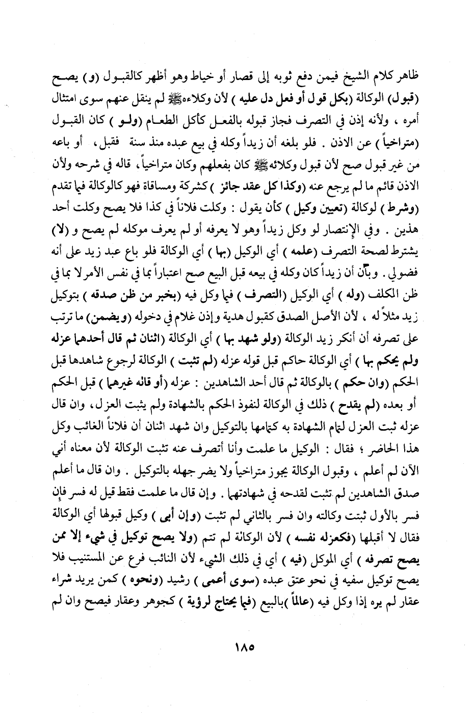(وَإِنْ أَبَى) وَكِيلٌ قَبُولَهَا أَيْ الْوَكَالَةِ فَقَالَ لَا أَقْبَلُهَا (فَكَعَزْلِهِ نَفْسَهُ) ; لِأَنَّ الْوَكَالَةَ لَمْ تَتِمَّ (وَلَا يَصِحُّ تَوْكِيلٌ فِي شَيْءٍ إلَّا مِمَّنْ يَصِحُّ تَصَرُّفُهُ) أَيْ الْمُوَكِّلِ (فِيهِ) أَيْ فِي ذَلِكَ الشَّيْءِ ; لِأَنَّ النَّائِبَ فَرْعٌ عَنْ الْمُسْتَنِيبِ فَلَا يَصِحُّ تَوْكِيلُ سَفِيهٍ فِي نَحْوِ عِتْقِ عَبْدِهِ (سِوَى أَعْمَى) رَشِيدٍ (وَنَحْوِهِ) كَمَنْ يُرِيدُ شِرَاءَ عَقَارٍ لَمْ يَرَهُ إذَا وَكَّلَ فِيهِ (عَالِمًا) بِالْبَيْعِ (فِيمَا يَحْتَاجُ لِرُؤْيَةٍ) كَجَوْهَرٍ وَعَقَارٍ فَيَصِحُّ وَإِنْ لَمْ