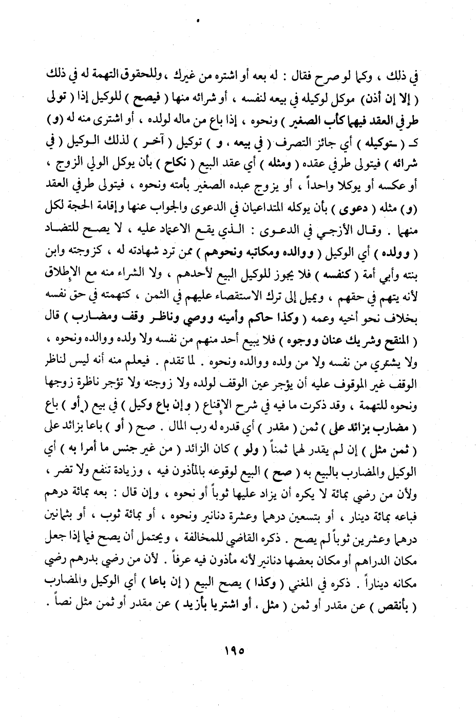 قَالَ (الْمُنَقِّحُ وَشَرِيكُ عَنَانٍ وَوُجُوهٍ) فَلَا يَبِيعُ أَحَدٌ مِنْهُمْ مِنْ نَفْسِهِ وَلَا وَلَدِهِ وَوَالِدِهِ وَنَحْوَهُ، وَلَا يَشْتَرِي مِنْ نَفْسِهِ وَلَا مِنْ وَلَدِهِ وَوَالِدِهِ وَنَحْوَهُ لِمَا تَقَدَّمَ فَيُعْلَمُ مِنْهُ أَنَّهُ لَيْسَ لِنَاظِرِ الْوَقْفِ غَيْرُ الْمَوْقُوفِ عَلَيْهِ أَنْ يُؤَجِّرَ عَيْنَ الْوَقْفِ لِوَلَدِهِ وَلَا زَوْجَتِهِ، وَلَا تُؤَجِّرُ نَاظِرَةٌ زَوْجَهَا وَنَحْوَهُ لِلتُّهْمَةِ، وَقَدْ ذَكَرْتُ مَا فِيهِ فِي شَرْحِ الْإِقْنَاعِ