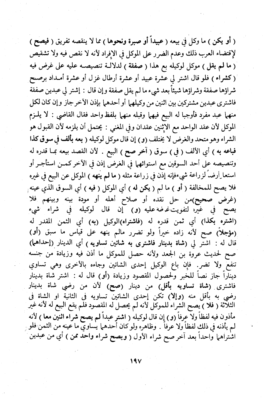 (أَوْ يَكُنْ) مَا وُكِّلَ فِي بَيْعِهِ (عَبِيدًا أَوْ صُبْرَةً وَنَحْوهَا) مِمَّا لَا يَنْقُصُهُ تَفْرِيقٌ (فَيَصِحُّ) لِاقْتِضَاءِ الْعَرَبِ ذَلِكَ وَعَدَمِ الضَّرَرِ عَلَى الْمُوَكِّلِ فِي الْإِفْرَادِ ; لِأَنَّهُ لَا نَقْصَ فِيهِ وَلَا تَشْقِيصَ (مَا لَمْ يَقُلْ) مُوَكِّلٌ لِوَكِيلِهِ بِعْ هَذَا (صَفْقَةً) لِدَلَالَةِ تَنْصِيصِهِ عَلَيْهِ عَلَى غَرَضٍ فِيهِ (كَشِرَاءٍ) فَلَوْ قَالَ اشْتَرِ لِي عَشَرَةَ عَبِيدٍ أَوْ عَشَرَةَ أَرْطَالِ غَزْلٍ أَوْ عَشَرَةَ أَمْدَادِ بُرٍّ صَحَّ شِرَاؤُهَا صَفْقَةً وَشِرَاؤُهَا شَيْئًا بَعْدَ شَيْءٍ مَا لَمْ يَقُلْ صَفْقَةً.