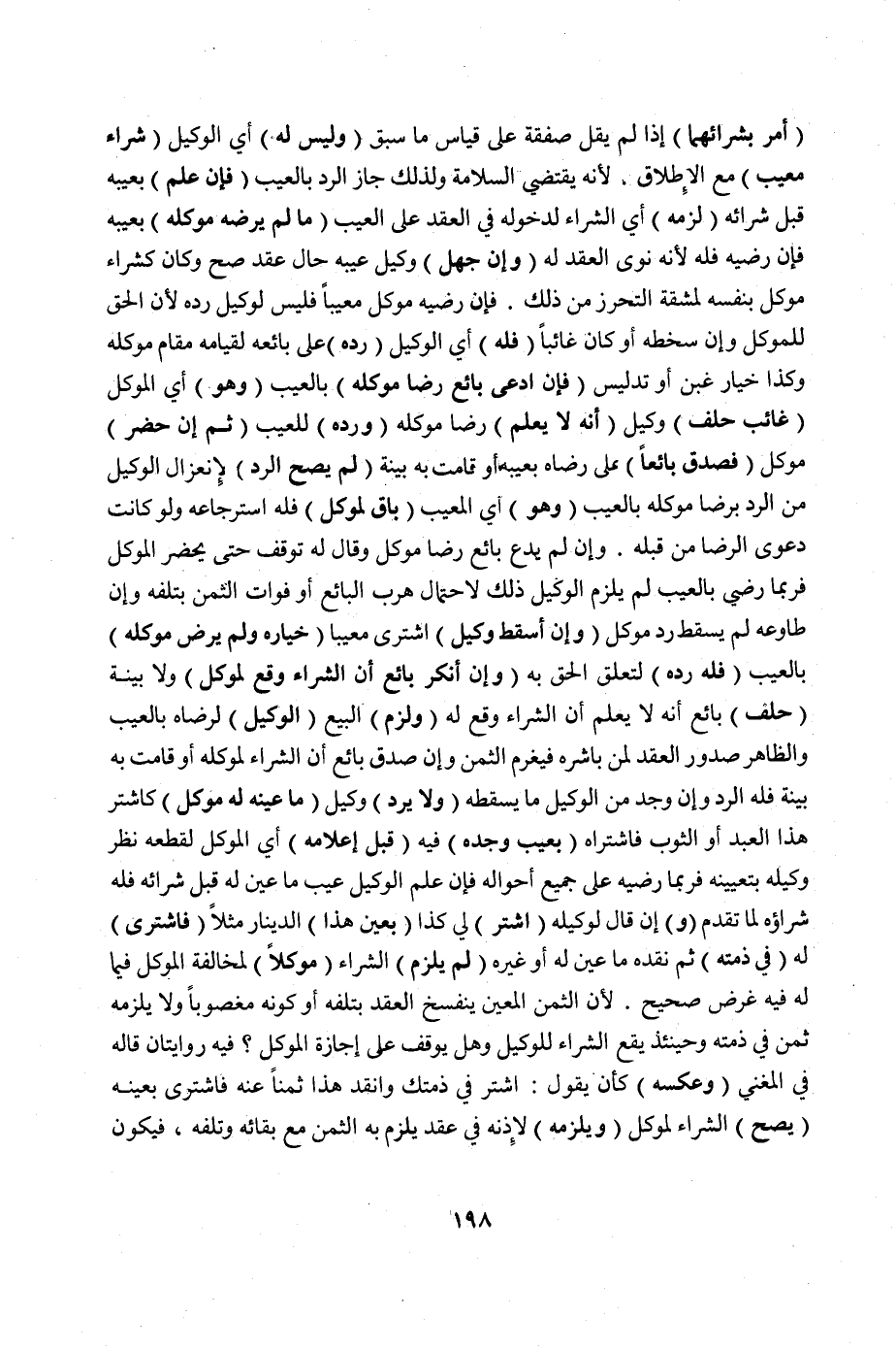 (وَلَيْسَ لَهُ) أَيْ الْوَكِيلِ (شِرَاءُ مَعِيبٍ) مَعَ الْإِطْلَاقِ ; لِأَنَّهُ يَقْتَضِي السَّلَامَةَ ; وَلِذَلِكَ جَازَ الرَّدُّ بِالْعَيْبِ وَإِذَا عَلِمَ) بِعَيْبِهِ قَبْلَ شِرَائِهِ (لَزِمَهُ) أَيْ الشِّرَاءَ لِدُخُولِهِ فِي الْعَقْدِ عَلَى الْعَيْبِ (مَا لَمْ يَرْضَهُ مُوَكِّلُهُ) بِعَيْبِهِ فَإِنْ رَضِيَهُ فَلَهُ ; لِأَنَّهُ نَوَى الْعَقْدَ لَهُ (وَإِنْ جَهِلَ) وَكِيلٌ عَيْبَهُ حَالَ عَقْدٍ صَحَّ وَكَانَ كَشِرَاءِ مُوَكِّلٍ بِنَفْسِهِ لِمَشَقَّةِ التَّحَرُّزِ مِنْ ذَلِكَ فَإِنْ رَضِيَهُ مُوَكِّلٌ مَعِيبًا فَلَيْسَ لِوَكِيلٍ رَدُّهُ ; لِأَنَّ الْحَقَّ لِلْمُوَكِّلِ وَإِنْ سَخِطَهُ أَوْ كَانَ غَائِبًا (فَلَهُ) أَيْ الْوَكِيلِ (رَدُّهُ) عَلَى بَائِعِهِ لِقِيَامِهِ مَقَامَ مُوَكِّلِهِ، وَكَذَا خِيَارُ غَبْنٍ أَوْ تَدْلِيسٍ.