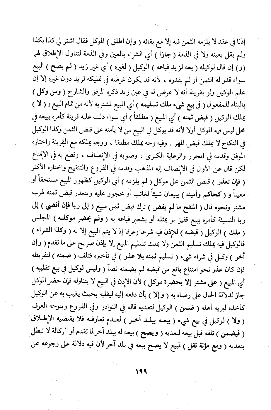 (وَمَنْ وُكِّلَ) بِالْبِنَاءِ لِلْمَفْعُولِ (فِي بَيْعِ شَيْءٍ مَلَكَ تَسْلِيمَهُ) أَيْ الْمَبِيعِ لِمُشْتَرِيهِ ; لِأَنَّهُ مِنْ تَمَامِ الْبَيْعِ وَ (لَا) يَمْلِكُ الْوَكِيلُ (قَبْضَ ثَمَنِهِ) أَيْ الْمَبِيعِ (مُطْلَقًا) أَيْ سَوَاءٌ دَلَّتْ عَلَيْهِ قَرِينَةٌ كَأَمْرِهِ بِبَيْعِهِ فِي مَحَلٍّ لَيْسَ فِيهِ الْمُوَكِّلُ أَوْ لَا ; لِأَنَّهُ قَدْ يُوَكِّلُ فِي الْبَيْعِ مَنْ لَا يَأْمَنُهُ عَلَى قَبْضِ الثَّمَنِ وَكَذَا الْوَكِيلُ فِي النِّكَاحِ لَا يَمْلِكُ قَبْضَ الْمَهْرِ وَفِيهِ وَجْهٌ يَمْلِكُ مُطْلَقًا، وَوَجْهٌ يَمْلِكُهُ مَعَ الْقَرِينَةِ وَاخْتَارَهُ الْمُوَفَّقُ وَقَدَّمَهُ فِي الْمُحَرَّرِ وَالرِّعَايَةِ الْكُبْرَى، وَصَوَّبَهُ فِي الْإِنْصَافِ، وَقَطَعَ بِهِ فِي الْإِقْنَاعِ لَكِنْ قَالَ عَنْ الْأَوَّلِ فِي الْإِنْصَافِ إنَّهُ الْمَذْهَبُ وَقَدَّمَهُ فِي الْفُرُوعِ وَالتَّنْقِيحِ وَاخْتَارَهُ الْأَكْثَرُ.