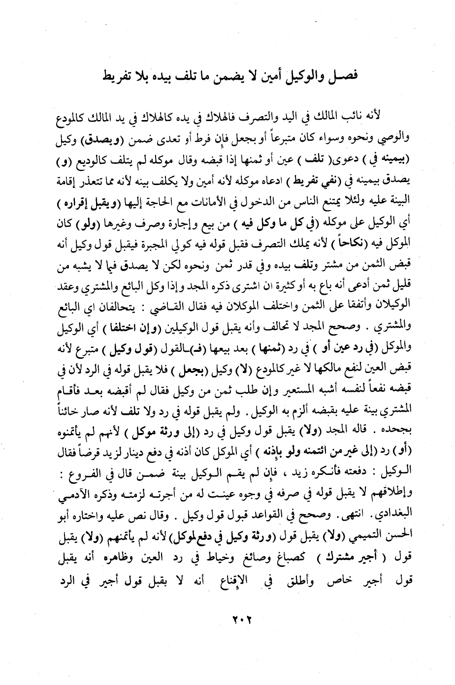 ٍ ; لِأَنَّهُ نَائِبُ الْمَالِكِ فِي الْيَدِ وَالتَّصَرُّفِ، فَالْهَلَاكُ فِي يَدِهِ كَالْهَلَاكِ فِي يَدِ الْمَالِكِ كَالْمُودَعِ وَالْوَصِيِّ وَنَحْوِهِ وَسَوَاءٌ كَانَ مُتَبَرِّعًا أَوْ بِجُعْلٍ فَإِنْ فَرَّطَ أَوْ تَعَدَّى ضَمِنَ (وَيُصَدَّقُ) وَكِيلٌ (بِيَمِينِهِ فِي) دَعْوَى (تَلَفِ) عَيْنٍ أَوْ ثَمَنِهَا إذَا قَبَضَهُ، وَقَالَ مُوَكِّلُهُ: لَمْ يَتْلَفْ كَالْوَدِيعِ (وَ) يُصَدَّقُ بِيَمِينِهِ فِي (نَفْيِ تَفْرِيطٍ) ادَّعَاهُ مُوَكِّلُهُ ; لِأَنَّهُ أَمِينٌ وَلَا يُكَلَّفُ بَيِّنَةً ; لِأَنَّهُ مِمَّا تَتَعَذَّرُ إقَامَةُ الْبَيِّنَةِ عَلَيْهِ وَلِئَلَّا يَمْتَنِعَ النَّاسُ مِنْ الدُّخُولِ فِي الْأَمَانَاتِ مَعَ الْحَاجَةِ إلَيْهَا.