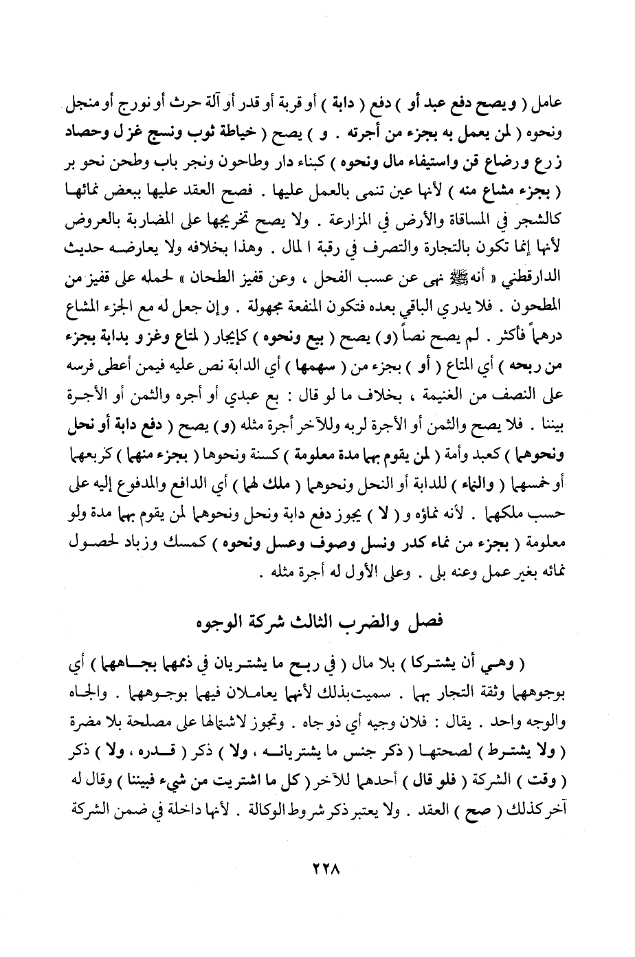 فَصْلٌ: وَالضَّرْبُ (الثَّالِثُ شَرِكَةُ الْوُجُوهِ) وَهِيَ أَنْ يَشْتَرِكَا بِلَا مَالٍ (فِي رِبْحِ مَا يَشْتَرِيَانِ فِي ذِمَمِهِمَا بِجَاهِهِمَا) أَيْ: بِوُجُوهِهِمَا وَثِقَةِ التُّجَّارِ بِهِمَا. سُمِّيَتْ بِذَلِكَ ; لِأَنَّهُمَا يُعَامِلَانِ فِيهِمَا بِوُجُوهِهِمَا. وَالْجَاهُ وَالْوَجْهُ وَاحِدٌ. يُقَالُ: فُلَانٌ وَجِيهٌ أَيْ: ذُو جَاهٍ. وَتَجُوزُ لِاشْتِمَالِهَا عَلَى مَصْلَحَةٍ بِلَا مَضَرَّةٍ (وَلَا يُشْتَرَطُ) لِصِحَّتِهَا (ذِكْرُ جِنْسِ مَا يَشْتَرِيَانِهِ، وَلَا) ذِكْرُ (قَدْرِهِ، وَلَا) ذِكْرُ (وَقْتِ) الشَّرِكَةِ (فَلَوْ قَالَ) أَحَدُهُمَا لِلْآخَرِ: (كُلُّ مَا اشْتَرَيْتُ مِنْ شَيْءٍ فَبَيْنَنَا) وَقَالَ لَهُ آخَرُ: كَذَلِكَ (صَحَّ) الْعَقْدُ وَلَا يُعْتَبَرُ ذِكْرُ شُرُوطِ الْوَكَالَةِ ; لِأَنَّهَا دَاخِلَةٌ فِي ضِمْنِ الشَّرِكَةِ