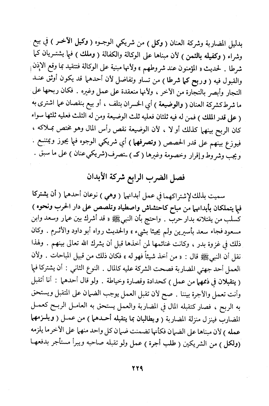 فَصْلٌ الضَّرْبُ الرَّابِعُ شَرِكَةُ الْأَبْدَانِ سُمِّيَتْ بِذَلِكَ ; لِاشْتِرَاكِهِمَا فِي عَمَلِ أَبْدَانِهِمَا (وَهِيَ) نَوْعَانِ: أَحَدُهُمَا (أَنْ يَشْتَرِكَا فِيمَا يَتَمَلَّكَانِ بِأَبْدَانِهِمَا مِنْ مُبَاحٍ كَاحْتِشَاشٍ وَاصْطِيَادٍ وَتَلَصُّصٍ عَلَى دَارِ الْحَرْبِ وَنَحْوِهِ) كَسَلْبِ مَنْ يَقْتُلَانِهِ بِدَارِ حَرْبٍ. وَاحْتُجَّ بِأَنَّ «النَّبِيَّ صَلَّى اللَّهُ عَلَيْهِ وَسَلَّمَ قَدْ أَشْرَكَ بَيْنَ عَمَّارٍ وَسَعْدٍ وَابْنِ مَسْعُودٍ فَجَاءَ سَعْدٌ بِأَسِيرَيْنِ وَلَمْ يَجِيئَا بِشَيْءٍ» وَالْحَدِيثُ رَوَاهُ أَبُو دَاوُد وَالْأَثْرَمُ. وَكَانَ ذَلِكَ فِي غَزْوَةِ بَدْرٍ، وَكَانَتْ غَنَائِمُهَا لِمَنْ أَخَذَهَا قَبْلَ أَنْ يُشْرِكَ اللَّهُ تَعَالَى بَيْنَهُمْ. وَلِهَذَا نُقِلَ أَنَّ النَّبِيَّ صَلَّى اللَّهُ عَلَيْهِ وَسَلَّمَ قَالَ: «مَنْ أَخَذَ شَيْئًا فَهُوَ لَهُ» فَكَانَ ذَلِكَ مِنْ قَبِيلِ الْمُبَاحَاتِ ; وَلِأَنَّ الْعَمَلَ أَحَدُ جِهَتَيْ الْمُضَارَبَةِ فَصَحَّتْ الشَّرِكَةُ عَلَيْهِ كَالْمَالِ. النَّوْعُ الثَّانِي: أَنْ يَشْتَرِكَا فِيمَا (يَتَقَبَّلَانِ فِي ذِمَمِهِمَا مِنْ عَمَلٍ) كَحِدَادَةٍ وَقِصَارَةٍ وَخِيَاطَةٍ.