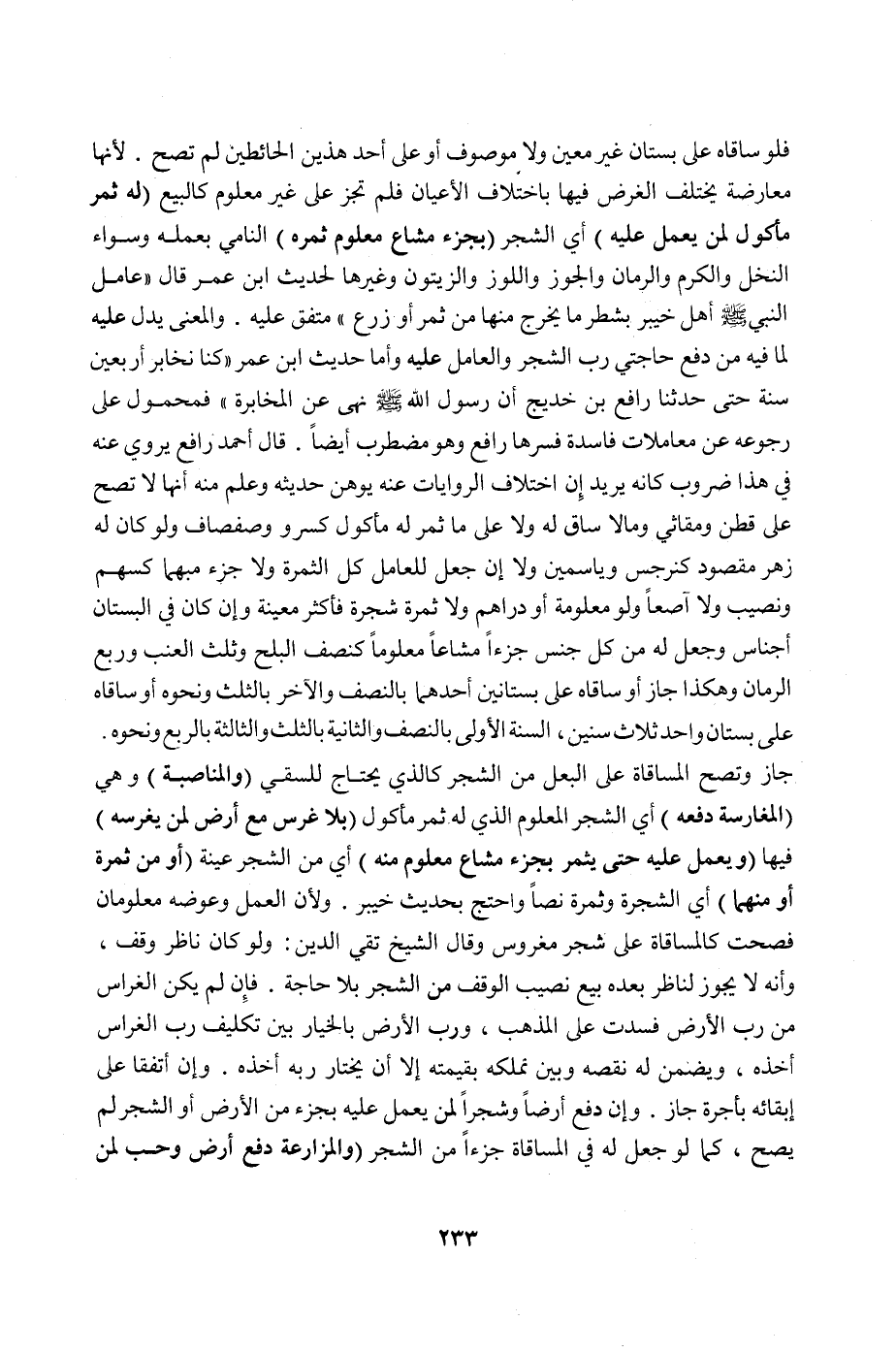 قَالَ أَحْمَدُ: رَافِعٌ يُرْوَى عَنْهُ فِي هَذَا ضُرُوبٌ كَأَنَّهُ يُرِيدُ أَنَّ اخْتِلَافَ الرِّوَايَاتِ عَنْهُ يُوهِنُ حَدِيثَهُ، وَعُلِمَ مِنْهُ أَنَّهَا لَا تَصِحُّ عَلَى قُطْنٍ وَمَقَاثِي وَمَا لَا سَاقَ لَهُ وَلَا عَلَى مَا لَا ثَمَرَ لَهُ مَأْكُولٌ كَسَرْوٍ وَصَفْصَافٍ وَلَوْ كَانَ لَهُ زَهْرٌ مَقْصُودٌ كَنَرْجِسِ وَيَاسَمِينٍ وَلَا إنْ جَعَلَ لِلْعَامِلِ كُلَّ الثَّمَرَةِ وَلَا جُزْءًا مُبْهَمًا كَسَهْمٍ وَنَصِيبٍ وَلَا آصُعًا وَلَوْ مَعْلُومَةً أَوْ دَرَاهِمَ وَلَا ثَمَرَةَ شَجَرَةٍ فَأَكْثَرَ مُعَيَّنَةٍ وَإِنْ كَانَ فِي الْبُسْتَانِ أَجْنَاسٌ وَجَعَلَ لَهُ مِنْ كُلِّ جِنْسٍ جُزْءًا مُشَاعًا مَعْلُومًا كَنِصْفِ الْبَلَحِ وَثُلُثِ الْعِنَبِ وَرُبُعِ الرُّمَّانِ وَهَكَذَا جَازَ أَوْ سَاقَاهُ عَلَى بُسْتَانَيْنِ: أَحَدُهُمَا بِالنِّصْفِ وَالْآخَرُ بِالثُّلُثِ وَنَحْوِهِ أَوْ سَاقَاهُ عَلَى بُسْتَانٍ وَاحِدٍ ثَلَاثَ سِنِينَ، السَّنَةُ الْأُولَى بِالنِّصْفِ وَالثَّانِيَةُ بِالثُّلُثِ وَالثَّالِثَةُ بِالرُّبُعِ وَنَحْوِهِ. جَازَ وَتَصِحُّ الْمُسَاقَاةُ عَلَى الْبَعْلِ مِنْ الشَّجَرِ كَاَلَّذِي يَحْتَاجُ لِلسَّقْيِ.