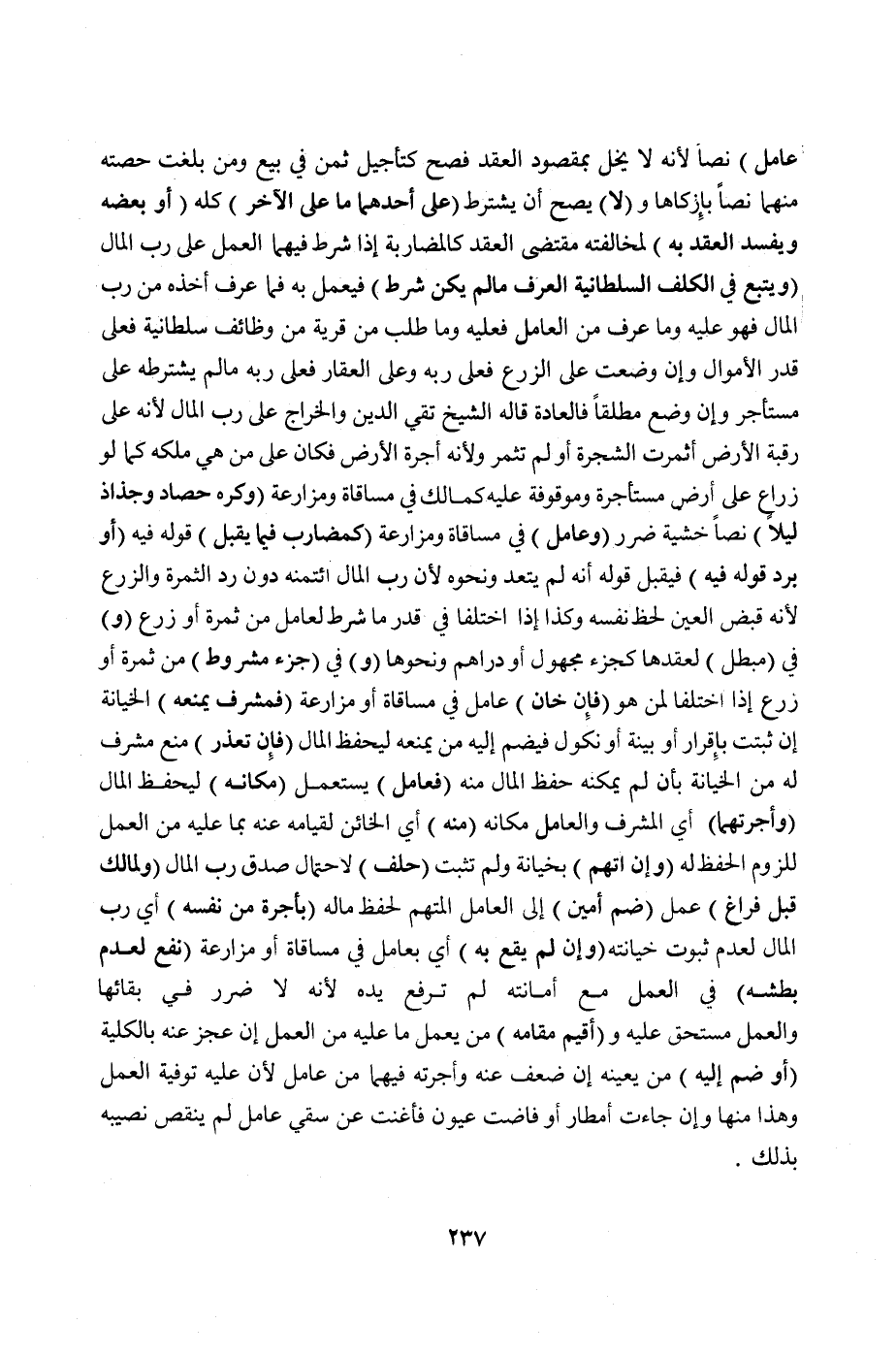 عَامِلٍ) نَصًّا لِأَنَّهُ لَا يُخِلُّ بِمَقْصُودِ الْعَقْدِ فَصَحَّ كَتَأْجِيلِ ثَمَنٍ فِي بَيْعٍ وَمَنْ بَلَغَتْ حِصَّتُهُ مِنْهُمَا نَصًّا بِأَزْكَاهَا و (لَا) يَصِحُّ أَنْ يُشْتَرَطَ (عَلَى أَحَدِهِمَا مَا عَلَى الْآخَرِ) كُلُّهُ (أَوْ بَعْضُهُ وَيَفْسُدُ الْعَقْدُ بِهِ) لِمُخَالِفَتِهِ مُقْتَضَى الْعَقْدِ كَالْمُضَارَبَةِ إذَا شُرِطَ فِيهِمَا الْعَمَلُ عَلَى رَبِّ الْمَالِ.