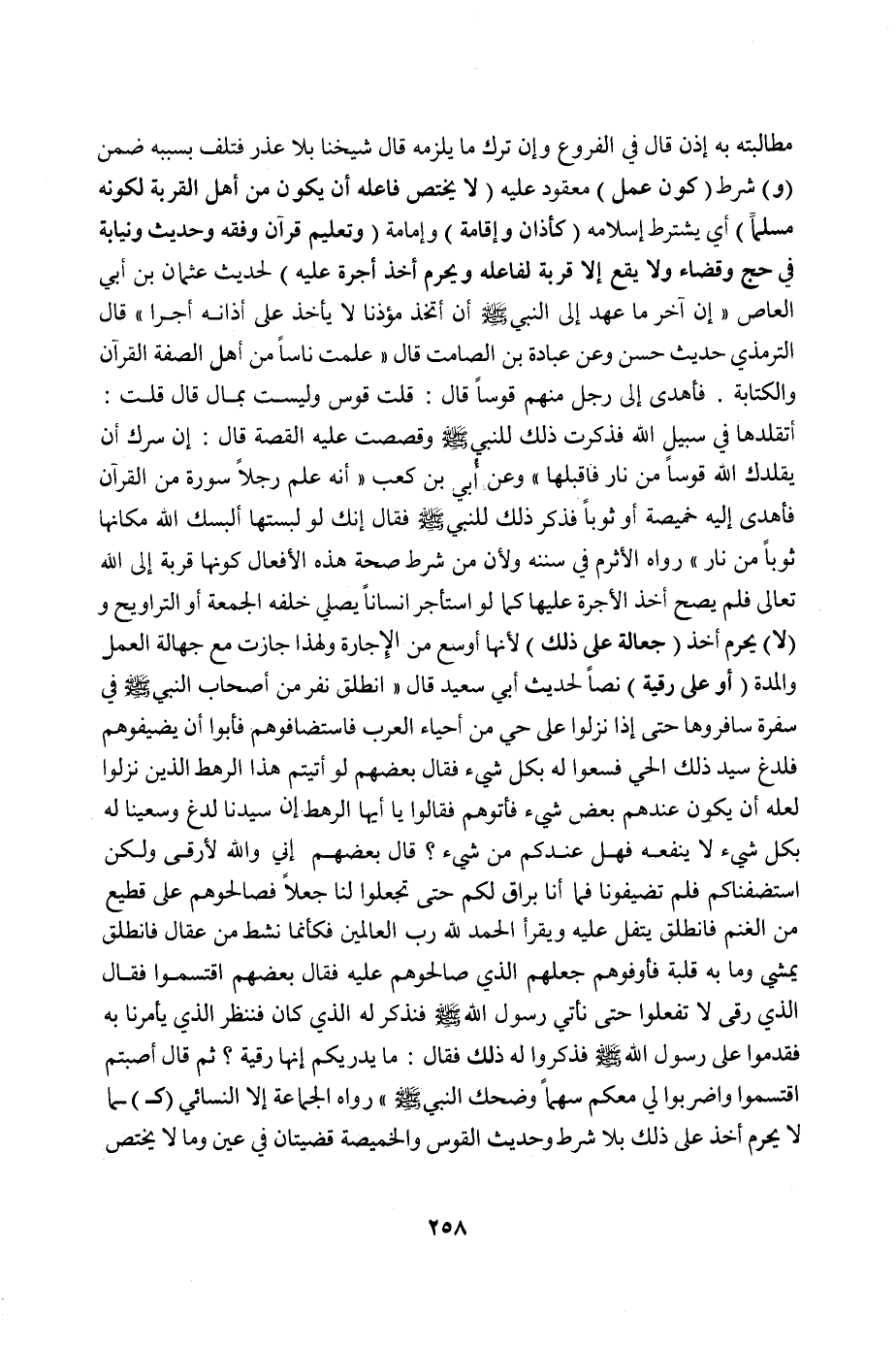 (أَوْ عَلَى رُقْيَةٍ) نَصًّا لِحَدِيثِ أَبِي سَعِيدٍ قَالَ: «انْطَلَقَ نَفَرٌ مِنْ أَصْحَابِ النَّبِيِّ صَلَّى اللَّهُ عَلَيْهِ وَسَلَّمَ فِي سَفْرَةٍ سَافَرُوهَا حَتَّى إذَا نَزَلُوا عَلَى حَيٍّ مِنْ أَحْيَاءِ الْعَرَبِ فَاسْتَضَافُوهُمْ، فَأَبَوْا أَنْ يُضَيِّفُوهُمْ فَلُدِغَ سَيِّدُ ذَلِكَ الْحَيِّ فَسَعَوْا لَهُ بِكُلِّ شَيْءٍ فَقَالَ بَعْضُهُمْ: لَوْ أَتَيْتُمْ هَذَا الرَّهْطَ الَّذِينَ نَزَلُوا لَعَلَّهُ أَنْ يَكُونَ عِنْدَهُمْ بَعْضُ شَيْءٍ فَأَتَوْهُمْ فَقَالُوا: يَا أَيُّهَا الرَّهْطُ إنَّ سَيِّدَنَا لُدِغَ وَسَعَيْنَا لَهُ بِكُلِّ شَيْءٍ لَا يَنْفَعُهُ فَهَلْ عِنْدَكُمْ مِنْ شَيْءٍ؟ قَالَ بَعْضُهُمْ: إنِّي وَاَللَّهِ لَأَرْقِي وَلَكِنْ اسْتَضَفْنَاكُمْ فَلَمْ تُضَيِّفُونَا فَمَا أَنَا بِرَاقٍ لَكُمْ حَتَّى تَجْعَلُوا لَنَا جُعْلًا فَصَالَحُوهُمْ عَلَى قَطِيعٍ مِنْ الْغَنَمِ فَانْطَلَقَ يَتْفُلُ عَلَيْهِ وَيَقْرَأُ {" الْحَمْدُ لِلَّهِ رَبِّ الْعَالَمِينَ "} [الفاتحة: ٢] فَكَأَنَّمَا نَشِطَ مِنْ عِقَالٍ فَانْطَلَقَ يَمْشِي وَمَا بِهِ قَلَبَةٌ فَأَوْفَوْهُمْ جُعْلَهُمْ الَّذِي صَالَحُوهُمْ عَلَيْهِ فَقَالَ بَعْضُهُمْ: اقْتَسِمُوا فَقَالَ الَّذِي رَقَى: لَا تَفْعَلُوا حَتَّى نَأْتِيَ رَسُولَ اللَّهِ صَلَّى اللَّهُ عَلَيْهِ وَسَلَّمَ فَنَذْكُرَ لَهُ الَّذِي كَانَ فَنَنْظُرَ الَّذِي يَأْمُرُنَا بِهِ فَقَدِمُوا عَلَى رَسُولِ اللَّهِ صَلَّى اللَّهُ عَلَيْهِ وَسَلَّمَ فَذَكَرُوا لَهُ ذَلِكَ فَقَالَ: وَمَا يُدْرِيكُمْ أَنَّهَا رُقْيَةٌ؟ ثُمَّ قَالَ: أَصَبْتُمْ اقْتَسِمُوا وَاضْرِبُوا لِي مَعَكُمْ سَهْمًا وَضَحِكَ النَّبِيُّ صَلَّى اللَّهُ عَلَيْهِ وَسَلَّمَ» رَوَاهُ الْجَمَاعَةُ إلَّا النَّسَائِيّ.