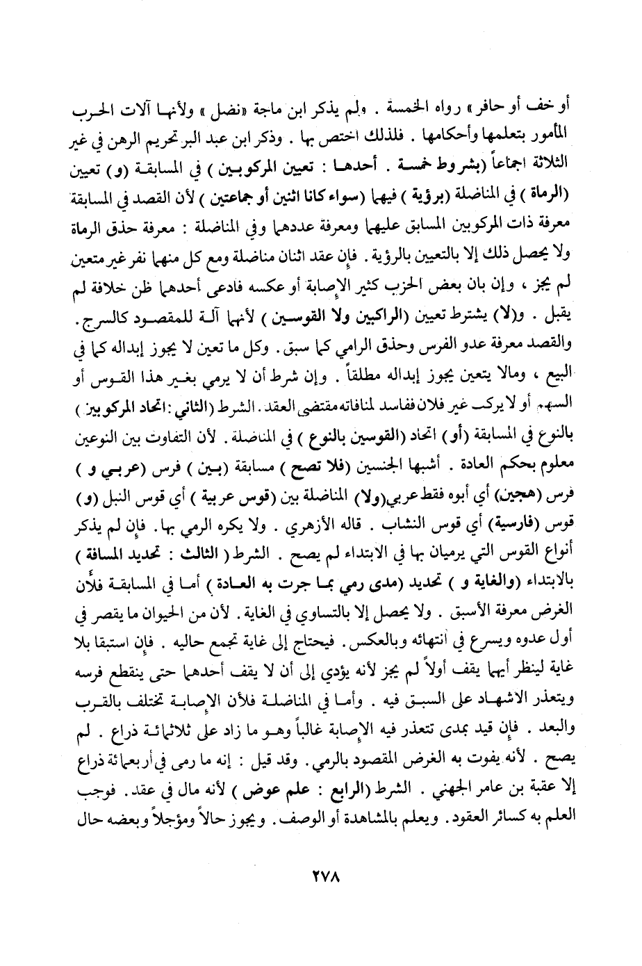 فَلِذَلِكَ اخْتَصَّ بِهَا. وَذَكَرَ ابْنُ عَبْدِ الْبَرِّ تَحْرِيمَ الرَّهْنِ فِي غَيْرِ الثَّلَاثَةِ إجْمَاعًا (بِشُرُوطٍ خَمْسَةٍ. أَحَدُهَا: تَعْيِينُ الْمَرْكُوبَيْنِ) فِي الْمُسَابَقَةِ (وَ) تَعْيِينُ (الرُّمَاةِ) فِي الْمُنَاضَلَةِ (بِرُؤْيَةٍ) فِيهِمَا (سَوَاءٌ كَانَا اثْنَيْنِ أَوْ جَمَاعَتَيْنِ) ; لِأَنَّ الْقَصْدَ فِي الْمُسَابَقَةِ مَعْرِفَةُ ذَاتِ الْمَرْكُوبَيْنِ الْمُسَابَقِ عَلَيْهِمَا وَمَعْرِفَةُ عَدَدِهِمَا وَفِي الْمُنَاضَلَةِ: مَعْرِفَةُ حِذْقِ الرُّمَاةِ وَلَا يَحْصُلُ ذَلِكَ إلَّا بِالتَّعْيِينِ بِالرُّؤْيَةِ. فَإِنْ عَقَدَ اثْنَانِ مُنَاضَلَةً وَمَعَ كُلٍّ مِنْهُمَا نَفَرٌ غَيْرُ مُتَعَيَّنٍ لَمْ يَجُزْ، وَإِنْ بَانَ بَعْضُ الْحِزْبِ كَثِيرُ الْإِصَابَةِ أَوْ عَكْسِهِ فَادَّعَى أَحَدُهُمَا ظَنَّ خِلَافِهِ لَمْ يُقْبَلْ. وَ (لَا) يُشْتَرَطُ تَعْيِينُ (الرَّاكِبَيْنِ وَلَا الْقَوْسَيْنِ) ; لِأَنَّهُمَا آلَةٌ لِلْمَقْصُودِ كَالسَّرْجِ. وَالْقَصْدُ مَعْرِفَةُ عَدْوِ الْفَرَسِ وَحِذْقِ الرَّامِي كَمَا سَبَقَ.