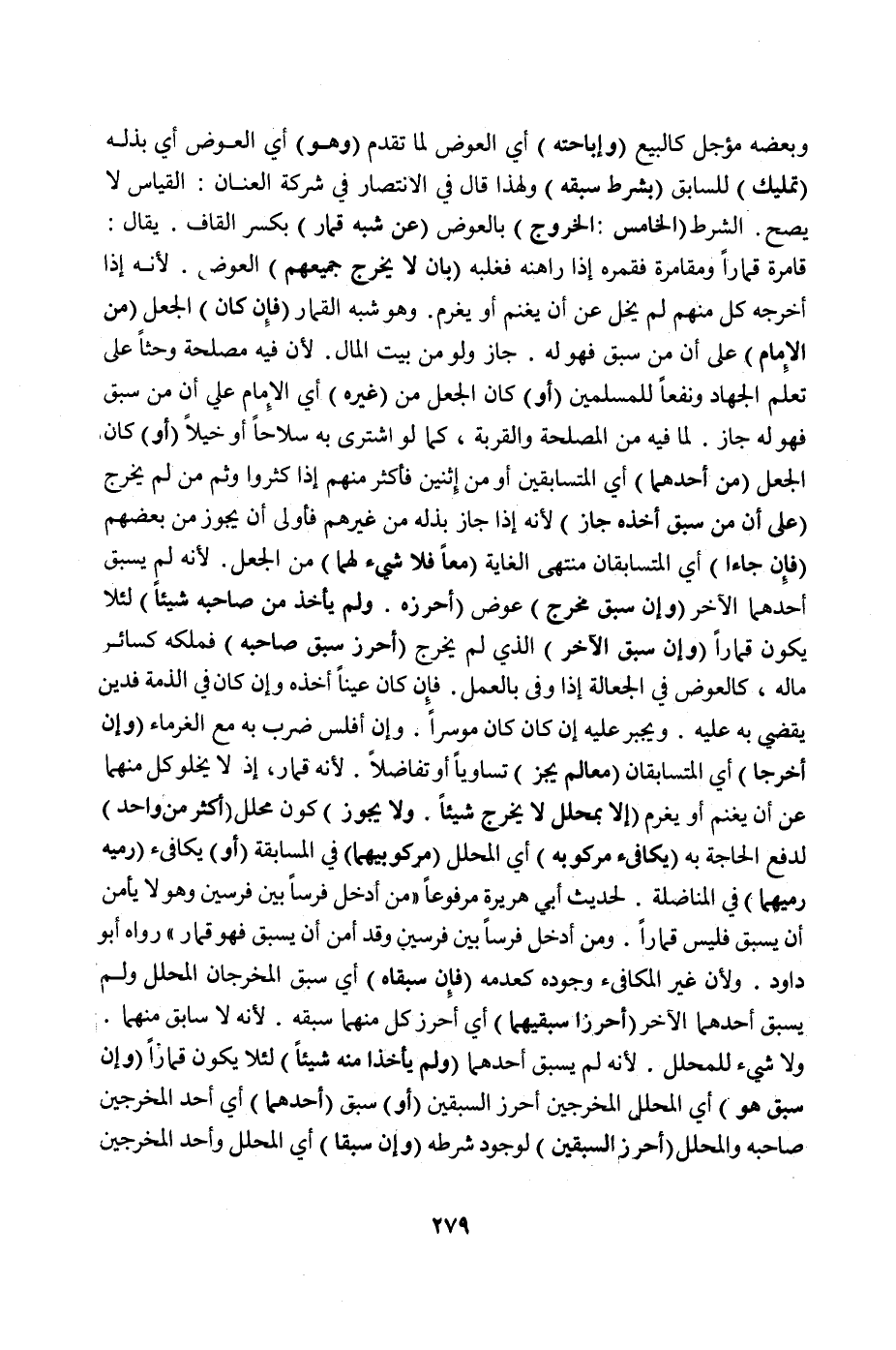 وَبَعْضُهُ مُؤَجَّلٌ كَالْبَيْعِ (وَإِبَاحَتُهُ) أَيْ: الْعِوَضِ لِمَا تَقَدَّمَ (وَهُوَ) أَيْ: الْعِوَضُ أَيْ: بَذْلُهُ (تَمْلِيكٌ) لِلسَّابِقِ (بِشَرْطِ سَبْقِهِ) وَلِهَذَا قَالَ فِي الِانْتِصَارِ فِي شَرِكَةِ الْعِنَانِ: الْقِيَاسُ لَا يَصِحُّ الشَّرْطُ (الْخَامِسُ: الْخُرُوجُ) بِالْعِوَضِ (عَنْ شِبْهِ قِمَارٍ) بِكَسْرِ الْقَافِ. يُقَالُ: قَامَرَهُ قِمَارًا وَمُقَامَرَةً فَقَمَرَهُ إذَا رَاهَنَهُ فَغَلَبَهُ (بِأَنْ لَا يُخْرِجَ جَمِيعُهُمْ) الْعِوَضَ. لِأَنَّهُ إذَا أَخْرَجَهُ كُلٌّ مِنْهُمْ لَمْ يَخْلُ عَنْ أَنْ يَغْنَمَ أَوْ يَغْرَمَ وَهُوَ شِبْهُ الْقِمَارِ.