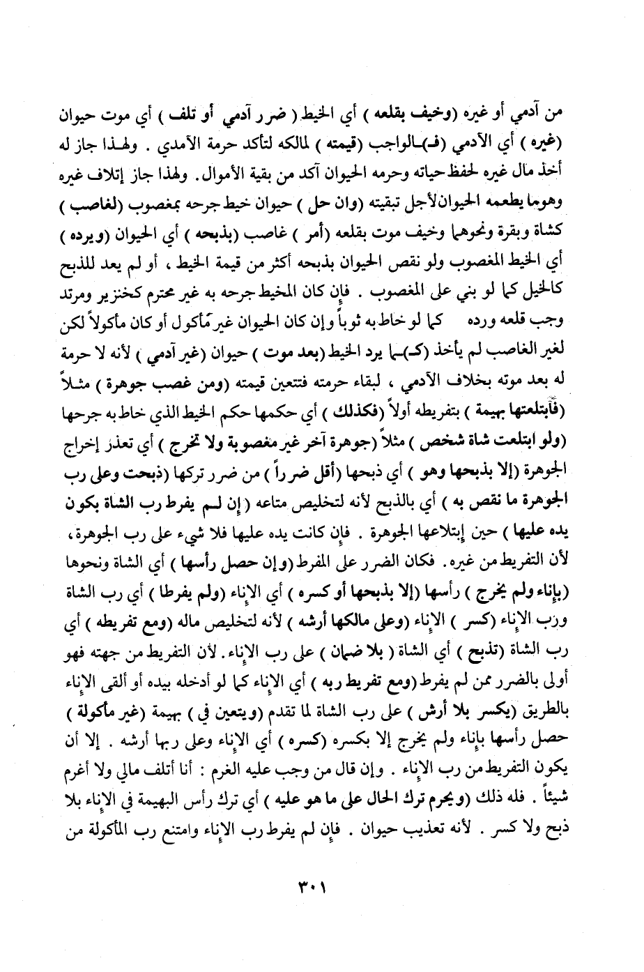 مِنْ آدَمِيٍّ أَوْ غَيْرِهِ (وَخِيفَ بِقَلْعِهِ) أَيْ الْخَيْطِ (ضَرَرُ آدَمِيٍّ أَوْ تَلَفُ) أَيْ: مَوْتُ حَيَوَانِ (غَيْرِهِ) أَيْ: الْآدَمِيِّ (فَ) الْوَاجِبُ (قِيمَتُهُ) لِمَالِكِهِ لِتَأَكُّدِ حُرْمَةِ الْآدَمِيِّ. وَلِهَذَا جَازَ لَهُ أَخْذُ مَالِ غَيْرِهِ لِحِفْظِ حَيَاتِهِ وَحُرْمَةُ الْحَيَوَانِ آكَدُ مِنْ بَقِيَّةِ الْأَمْوَالِ. وَلِهَذَا جَازَ إتْلَافُ غَيْرِهِ وَهُوَ مَا يَطْعَمُهُ الْحَيَوَانُ لِأَجْلِ تَبْقِيَتِهِ (وَإِنْ حَلَّ) حَيَوَانٌ خِيطَ جُرْحِهِ بِمَغْصُوبٍ (لِغَاصِبٍ) كَشَاةٍ وَبَقَرَةٍ وَنَحْوِهِمَا وَخِيفَ مَوْتٌ بِقَلْعِهِ (أُمِرَ) غَاصِبٌ (بِذَبْحِهِ) أَيْ: الْحَيَوَانِ (وَيَرُدُّهُ) أَيْ: الْخَيْطَ الْمَغْصُوبَ وَلَوْ نَقَصَ الْحَيَوَانُ بِذَبْحِهِ أَكْثَرَ مِنْ قِيمَةِ الْخَيْطِ، أَوْ لَمْ يُعَدَّ لِلذَّبْحِ كَالْخَيْلِ كَمَا لَوْ بُنِيَ عَلَى الْمَغْصُوبِ.