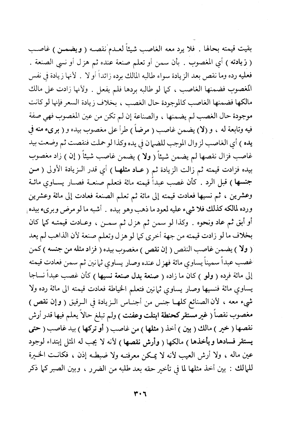 بَقِيَتْ قِيمَتُهُ بِحَالِهَا. فَلَا يَرُدُّ مَعَهُ الْغَاصِبُ شَيْئًا لِعَدَمِ نَقْصِهِ (وَيَضْمَنُ) غَاصِبٌ (زِيَادَتَهُ) أَيْ: الْمَغْصُوبِ. بِأَنْ سَمِنَ أَوْ تَعَلَّمَ صَنْعَةً عِنْدَهُ ثُمَّ هَزَلَ أَوْ نَسِيَ الصَّنْعَةَ. فَعَلَيْهِ رَدُّهُ وَمَا نَقَصَ بَعْدَ الزِّيَادَةِ سَوَاءٌ طَالَبَهُ الْمَالِكُ بِرَدِّهِ زَائِدًا أَوْ لَا. لِأَنَّهَا زِيَادَةٌ فِي نَفْسِ الْمَغْصُوبِ فَضَمِنَهَا الْغَاصِبُ، كَمَا لَوْ طَالَبَهُ بِرَدِّهَا فَلَمْ يَفْعَلْ. وَلِأَنَّهَا زَادَتْ عَلَى مَالِكِ مَالِكِهَا فَضَمِنَهَا الْغَاصِبُ كَالْمَوْجُودَةِ حَالَ الْغَصْبِ، بِخِلَافِ زِيَادَةِ السِّعْرِ فَإِنَّهَا لَوْ كَانَتْ مَوْجُودَةً حَالَ الْغَصْبِ لَمْ يَضْمَنْهَا، وَالصِّنَاعَةُ إنْ لَمْ تَكُنْ مِنْ عَيْنِ الْمَغْصُوبِ فَهِيَ صِفَةٌ فِيهِ وَتَابِعَةٌ لَهُ.