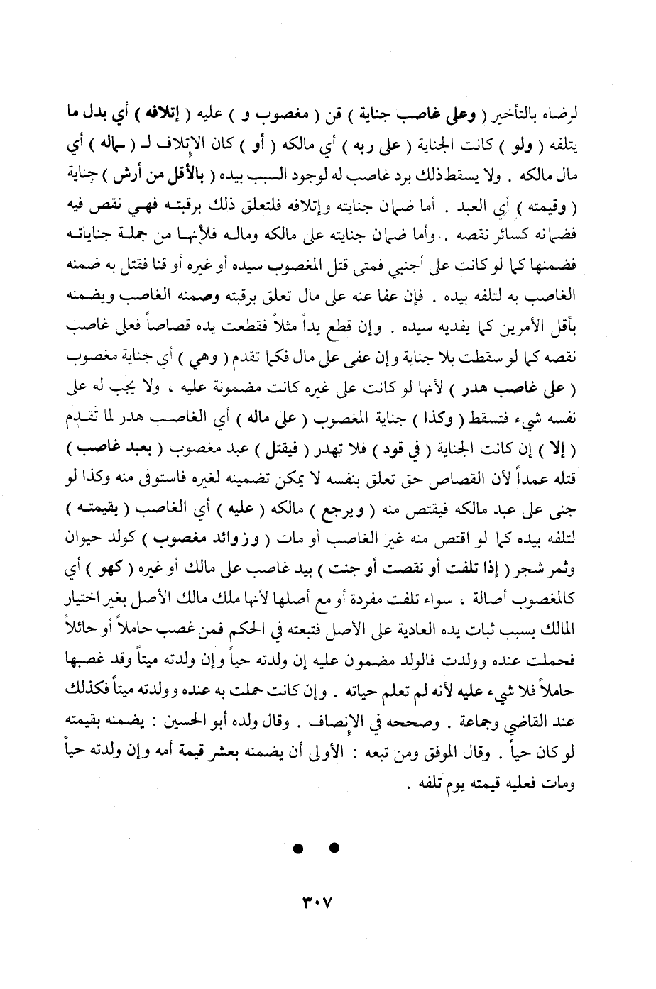 (وَزَوَائِدُ مَغْصُوبٍ) كَوَلَدِ حَيَوَانٍ وَثَمَرِ شَجَرٍ (إذَا تَلِفَتْ أَوْ نَقَصَتْ أَوْ جَنَتْ) بِيَدِ غَاصِبٍ عَلَى مَالِكٍ أَوْ غَيْرِهِ (كَهُوَ) أَيْ كَالْمَغْصُوبِ أَصَالَةً، سَوَاءٌ تَلِفَتْ مُفْرَدَةً أَوْ مَعَ أَصْلِهَا ; لِأَنَّهَا مِلْكُ مَالِكِ الْأَصْلِ بِغَيْرِ اخْتِيَارِ الْمَالِكِ بِسَبَبِ ثَبَاتِ يَدِهِ الْعَادِيَةِ عَلَى الْأَصْلِ فَتَبِعَتْهُ فِي الْحُكْمِ فَمَنْ غَصَبَ حَامِلًا أَوْ حَائِلًا فَحَمَلَتْ عِنْدَهُ وَوَلَدَتْ فَالْوَلَدُ مَضْمُونٌ عَلَيْهِ إنْ وَلَدَتْهُ حَيًّا وَإِنْ وَلَدَتْهُ مَيِّتًا وَقَدْ غَصَبَهَا حَامِلًا فَلَا شَيْءَ عَلَيْهِ ; لِأَنَّهُ لَمْ تُعْلَمْ حَيَاتُهُ. وَإِنْ كَانَتْ حَمَلَتْ بِهِ عِنْدَهُ وَوَلَدَتْهُ مَيِّتًا فَكَذَلِكَ عِنْدَ الْقَاضِي وَجَمَاعَةٍ. وَصَحَّحَهُ فِي الْإِنْصَافِ. وَقَالَ وَلَدُهُ أَبُو الْحُسَيْنِ: يَضْمَنُهُ بِقِيمَتِهِ لَوْ كَانَ حَيًّا. وَقَالَ الْمُوَفَّقُ وَمَنْ تَبِعَهُ: الْأَوْلَى أَنْ يَضْمَنَهُ بِعُشْرِ قِيمَةِ أُمِّهِ وَإِنْ وَلَدَتْهُ حَيًّا وَمَاتَ فَعَلَيْهِ قِيمَتُهُ يَوْمَ تَلَفِهِ.