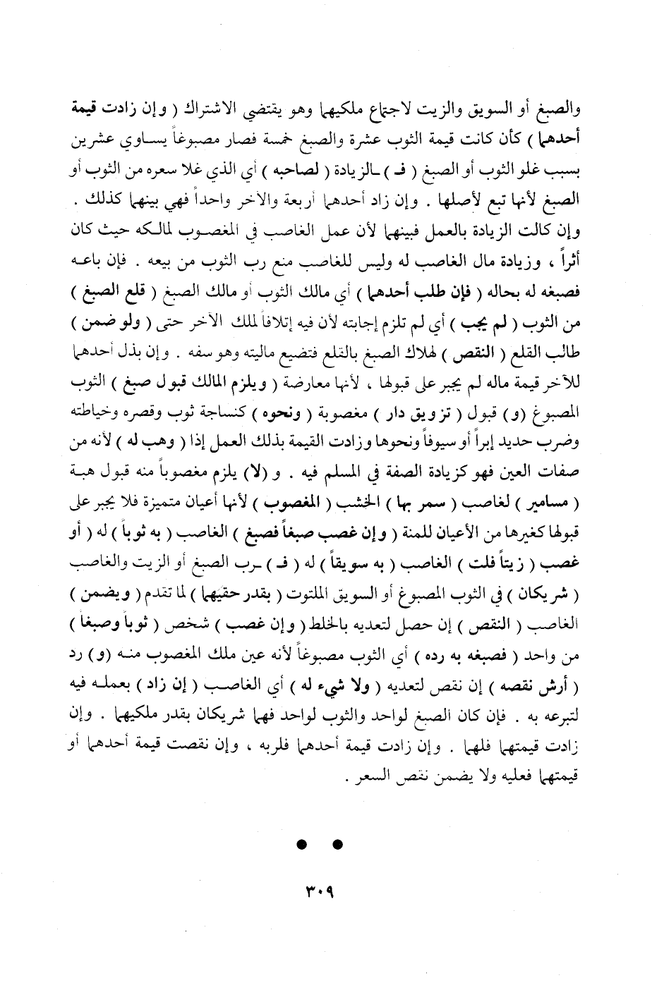 وَالصَّبْغِ أَوْ السَّوِيقِ وَالزَّيْتِ لِاجْتِمَاعِ مِلْكَيْهِمَا وَهُوَ يَقْتَضِي الِاشْتِرَاكَ (وَإِنْ زَادَتْ قِيمَةُ أَحَدِهِمَا) كَأَنْ كَانَتْ قِيمَةُ الثَّوْبِ عَشَرَةً وَالصَّبْغِ خَمْسَةً فَصَارَ مَصْبُوغًا يُسَاوِي عِشْرِينَ بِسَبَبِ غُلُوِّ الثَّوْبِ أَوْ الصَّبْغِ (فَ) الزِّيَادَةُ (لِصَاحِبِهِ) أَيْ: الَّذِي غَلَا سِعْرُهُ مِنْ الثَّوْبِ أَوْ الصَّبْغِ لِأَنَّهَا تَبَعٌ لِأَصْلِهَا، وَإِنْ زَادَ أَحَدُهُمَا أَرْبَعَةً وَالْآخَرُ وَاحِدًا فَهِيَ بَيْنَهُمَا كَذَلِكَ. وَإِنْ كَانَتْ الزِّيَادَةُ بِالْعَمَلِ فَبَيْنَهُمَا ; لِأَنَّ عَمَلَ الْغَاصِبِ فِي الْمَغْصُوبِ لِمَالِكِهِ حَيْثُ كَانَ أَثَرًا، وَزِيَادَةُ مَالِ الْغَاصِبِ لَهُ وَلَيْسَ لِلْغَاصِبِ مَنْعُ رَبِّ الثَّوْبِ مِنْ بَيْعِهِ. فَإِنْ بَاعَهُ فَصَبْغُهُ لَهُ بِحَالِهِ (فَإِنْ طَلَبَ أَحَدُهُمَا) أَيْ: مَالِكُ الثَّوْبِ، أَوْ مَالِكُ الصِّبْغِ (قَلْعَ الصِّبْغِ) مِنْ الثَّوْبِ (لَمْ يَجِبْ) أَيْ: لَمْ تَلْزَمْ إجَابَتُهُ ; لِأَنَّ فِيهِ إتْلَافًا لِمِلْكِ الْآخَرِ حَتَّى (وَلَوْ ضَمِنَ) طَالِبُ الْقَلْعِ (النَّقْصَ) لِهَلَاكِ الصِّبْغِ بِالْقَلْعِ فَتَضِيعُ مَالِيَّتُهُ وَهُوَ سَفَهٌ. وَإِنْ بَذَلَ أَحَدُهُمَا لِلْآخَرِ قِيمَةَ مَالِهِ لَمْ يُجْبَرْ عَلَى قَبُولِهَا، لِأَنَّهَا مُعَاوَضَةٌ. (وَيَلْزَمُ الْمَالِكَ قَبُولُ صَبْغِ) الثَّوْبِ الْمَصْبُوغِ (وَ) قَبُولُ (تَزْوِيقِ دَارٍ) مَغْصُوبَةٍ (وَنَحْوِهِ) كَنِسَاجَةِ ثَوْبٍ وَقَصْرِهِ وَخِيَاطَتِهِ وَضَرْبِ حَدِيدٍ إبَرًا أَوْ سُيُوفًا وَنَحْوَهَا وَزَادَتْ الْقِيمَةُ بِذَلِكَ الْعَمَلِ إذَا (وُهِبَ لَهُ) ; لِأَنَّهُ مِنْ صِفَاتِ الْعَيْنِ فَهُوَ كَزِيَادَةِ الصِّفَةِ فِي الْمُسْلَمِ فِيهِ.