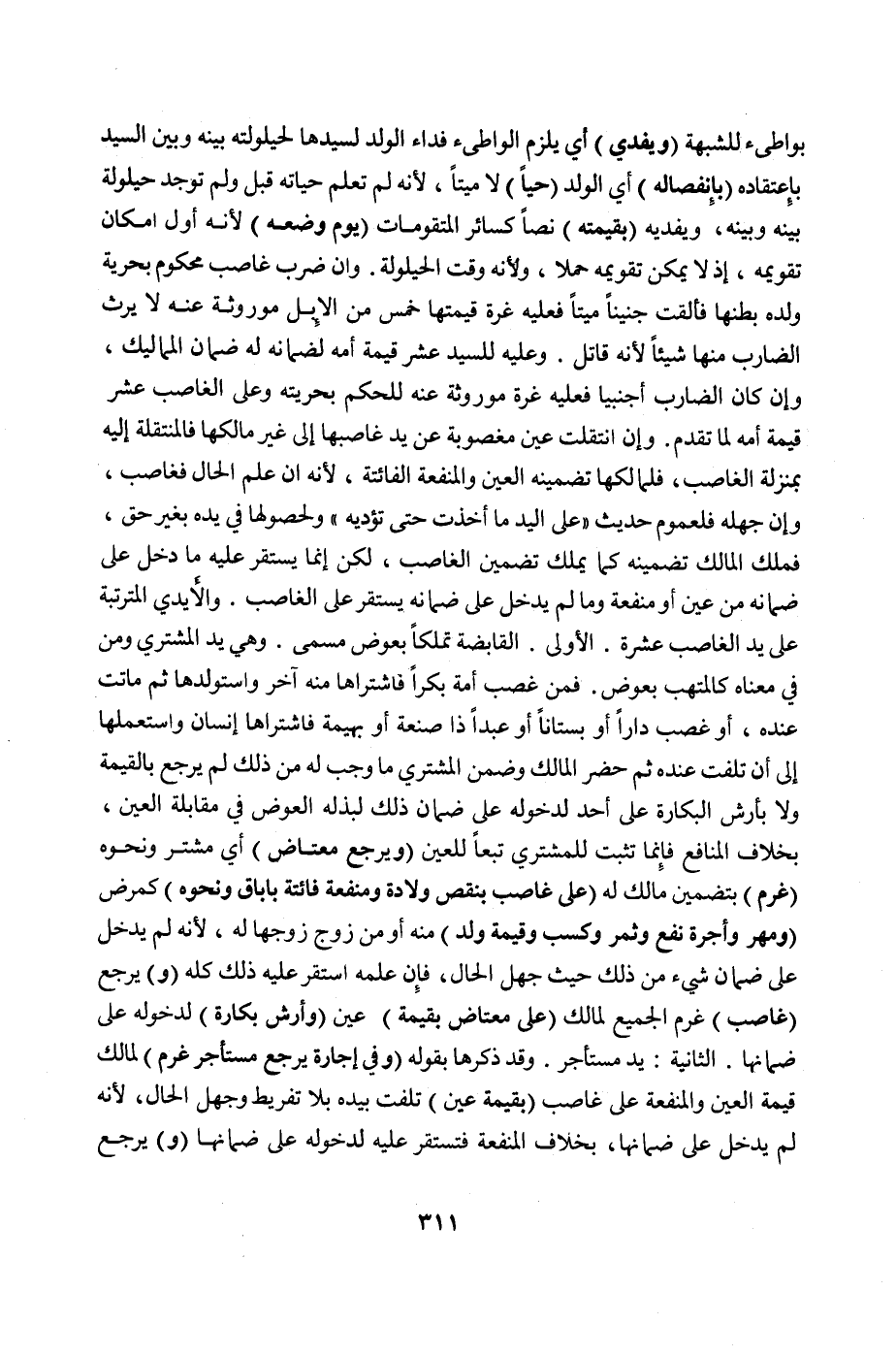 بِوَاطِئٍ لِلشُّبْهَةِ (وَيَفْدِي) أَيْ: يَلْزَمُ الْوَاطِئَ فِدَاءُ الْوَلَدِ لِسَيِّدِهَا لِحَيْلُولَتِهِ بَيْنَهُ وَبَيْنَ السَّيِّدِ بِاعْتِقَادِهِ (بِانْفِصَالِهِ) أَيْ: الْوَلَدِ (حَيًّا) لَا مَيِّتًا، لِأَنَّهُ لَمْ تُعْلَمْ حَيَاتُهُ قَبْلُ وَلَمْ تُوجَدْ حَيْلُولَةٌ بَيْنَهُ وَبَيْنَهُ، وَيَفْدِيهِ (بِقِيمَتِهِ) نَصًّا كَسَائِرِ الْمُتَقَوِّمَاتِ (يَوْمَ وَضْعِهِ) ; لِأَنَّهُ أَوَّلُ إمْكَانَ تَقْوِيمِهِ، إذْ لَا يُمْكِنُ تَقْوِيمُهُ حَمْلًا، وَلِأَنَّهُ وَقْتُ الْحَيْلُولَةِ. وَإِنْ ضَرَبَ غَاصِبٌ مَحْكُومٌ بِحُرِّيَّةِ وَلَدِهِ بَطْنَهَا فَأَلْقَتْ جَنِينًا مَيِّتًا فَعَلَيْهِ غُرَّةٌ قِيمَتُهَا خَمْسٌ مِنْ الْإِبِلِ مَوْرُوثَةٌ عَنْهُ لَا يَرِثُ الضَّارِبُ مِنْهَا شَيْئًا لِأَنَّهُ قَاتِلٌ. وَعَلَيْهِ لِلسَّيِّدِ عُشْرُ قِيمَةِ أُمِّهِ لِضَمَانِهِ لَهُ ضَمَانَ الْمَمَالِيكِ، وَإِنْ كَانَ الضَّارِبُ أَجْنَبِيًّا فَعَلَيْهِ غُرَّةٌ مَوْرُوثَةٌ عَنْهُ لِلْحُكْمِ بِحُرِّيَّتِهِ وَعَلَى الْغَاصِبِ عُشْرُ قِيمَةِ أُمِّهِ لِمَا تَقَدَّمَ. وَإِنْ انْتَقَلَتْ عَيْنٌ مَغْصُوبَةٌ عَنْ يَدِ غَاصِبِهَا إلَى غَيْرِ مَالِكِهَا فَالْمُنْتَقِلَةُ إلَيْهِ بِمَنْزِلَةِ الْغَاصِبِ، فَلِمَالِكِهَا تَضْمِينُهُ الْعَيْنَ وَالْمَنْفَعَةَ الْفَائِتَةَ، لِأَنَّهُ إنْ عَلِمَ الْحَالَ فَغَاصِبٌ، وَإِنْ جَهِلَهُ فَلِعُمُومِ حَدِيثِ «: عَلَى الْيَدِ مَا أَخَذَتْ حَتَّى تُؤَدِّيَهُ» " وَلِحُصُولِهَا فِي يَدِهِ بِغَيْرِ حَقٍّ، فَمَلَكَ الْمَالِكُ تَضْمِينَهُ كَمَا يَمْلِكُ تَضْمِينَ الْغَاصِبِ، لَكِنْ إنَّمَا يَسْتَقِرُّ عَلَيْهِ مَا دَخَلَ عَلَى ضَمَانِهِ مِنْ عَيْنٍ أَوْ مَنْفَعَةٍ وَمَا لَمْ يَدْخُلْ عَلَى ضَمَانِهِ يَسْتَقِرُّ عَلَى الْغَاصِبِ.