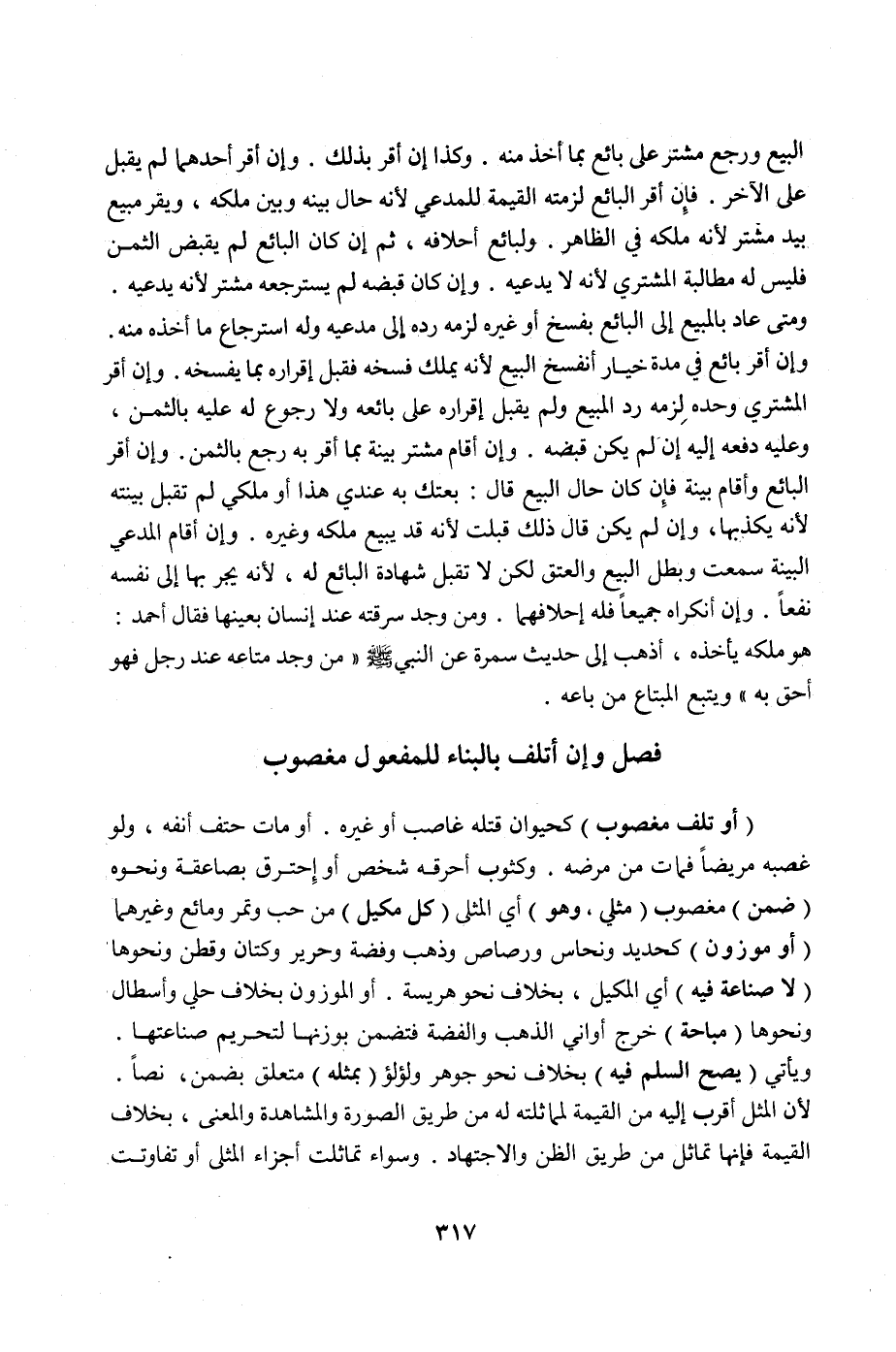 (فَصْلٌ وَإِنْ أُتْلِفَ) بِالْبِنَاءِ لِلْمَفْعُولِ مَغْصُوبٌ (أَوْ تَلِفَ مَغْصُوبٌ) كَحَيَوَانٍ قَتَلَهُ غَاصِبٌ أَوْ غَيْرُهُ. أَوْ مَاتَ حَتْفَ أَنْفِهِ، وَلَوْ غَصَبَهُ مَرِيضًا فَمَاتَ مِنْ مَرَضِهِ. وَكَثَوْبٍ أَحْرَقَهُ شَخْصٌ أَوْ احْتَرَقَ بِصَاعِقَةٍ وَنَحْوِهِ (ضُمِنَ) مَغْصُوبٌ (مِثْلِيٌّ. وَهُوَ) أَيْ الْمِثْلِيُّ (كُلُّ مَكِيلٍ) مِنْ حَبٍّ وَتَمْرٍ وَمَائِعٍ وَغَيْرِهِمَا (أَوْ مَوْزُونٍ) كَحَدِيدٍ وَنُحَاسٍ وَرَصَاصٍ وَذَهَبٍ وَفِضَّةٍ وَحَرِيرٍ وَكَتَّانٍ وَقُطْنٍ وَنَحْوِهَا، (لَا صِنَاعَةَ فِيهِ) أَيْ الْمَكِيلِ، بِخِلَافِ نَحْوِ هَرِيسَةٍ. أَوْ الْمَوْزُونِ بِخِلَافِ حُلِيٍّ وَأَسْطَالٍ وَنَحْوِهَا (مُبَاحَةٌ) خَرَجَ أَوَانِي الذَّهَبِ وَالْفِضَّةِ فَتُضْمَنُ بِوَزْنِهَا لِتَحْرِيمِ صِنَاعَتِهَا. وَيَأْتِي (يَصِحُّ السَّلَمُ فِيهِ) بِخِلَافٍ نَحْوِ جَوْهَرٍ وَلُؤْلُؤٍ (بِمِثْلِهِ) مُتَعَلِّقٌ بِضَمِنَ، نَصًّا. لِأَنَّ الْمِثْلَ أَقْرَبُ إلَيْهِ مِنْ الْقِيمَةِ لِمُمَاثَلَتِهِ لَهُ مِنْ طَرِيقِ الصُّورَةِ وَالْمُشَاهَدَةِ وَالْمَعْنَى، بِخِلَافِ الْقِيمَةِ فَإِنَّهَا تُمَاثِلُ مِنْ طَرِيقِ الظَّنِّ وَالِاجْتِهَادِ. وَسَوَاءٌ تَمَاثَلَتْ أَجْزَاءُ الْمِثْلِيِّ أَوْ تَفَاوَتَتْ