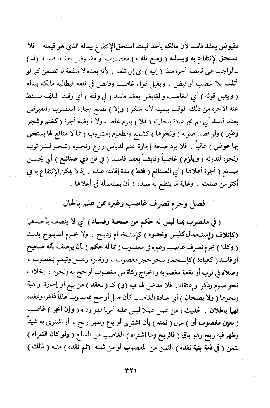 (فَصْلٌ وَحَرُمَ تَصَرُّفُ غَاصِبٍ وَغَيْرِهِ) مِمَّنْ عَلِمَ بِالْحَالِ (فِي مَغْصُوبٍ بِمَا لَيْسَ لَهُ حُكْمٌ مِنْ صِحَّةٍ وَفَسَادٍ) أَيْ: لَا يَتَّصِفُ بِأَحَدِهِمَا (كَإِتْلَافٍ وَاسْتِعْمَالٍ كَلُبْسٍ وَنَحْوِهِ) كَاسْتِخْدَامٍ وَذَبْحٍ. وَلَا يَحْرُمُ الْمَذْبُوحُ بِذَلِكَ (وَكَذَا) يَحْرُمُ تَصَرُّفُ غَاصِبٍ وَغَيْرِهِ فِي مَغْصُوبٍ (بِمَا لَهُ حُكْمٌ) بِأَنْ يُوصَفَ بِأَنَّهُ صَحِيحٌ أَوْ فَاسِدٌ (كَعِبَادَةٍ) كَاسْتِجْمَارٍ بِنَحْوِ حَجَرٍ مَغْصُوبٍ، وَوُضُوءٍ وَغُسْلٍ وَتَيَمُّمٍ بِمَغْصُوبٍ، وَصَلَاةٍ فِي ثَوْبٍ أَوْ بُقْعَةٍ مَغْصُوبَةٍ وَإِخْرَاجِ زَكَاةٍ مِنْ مَغْصُوبٍ أَوْ حَجٍّ بِهِ وَنَحْوِهِ، بِخِلَافٍ نَحْوِ صَوْمٍ وَذِكْرٍ وَاعْتِقَادٍ. فَلَا مَدْخَلَ لَهَا فِيهِ.
