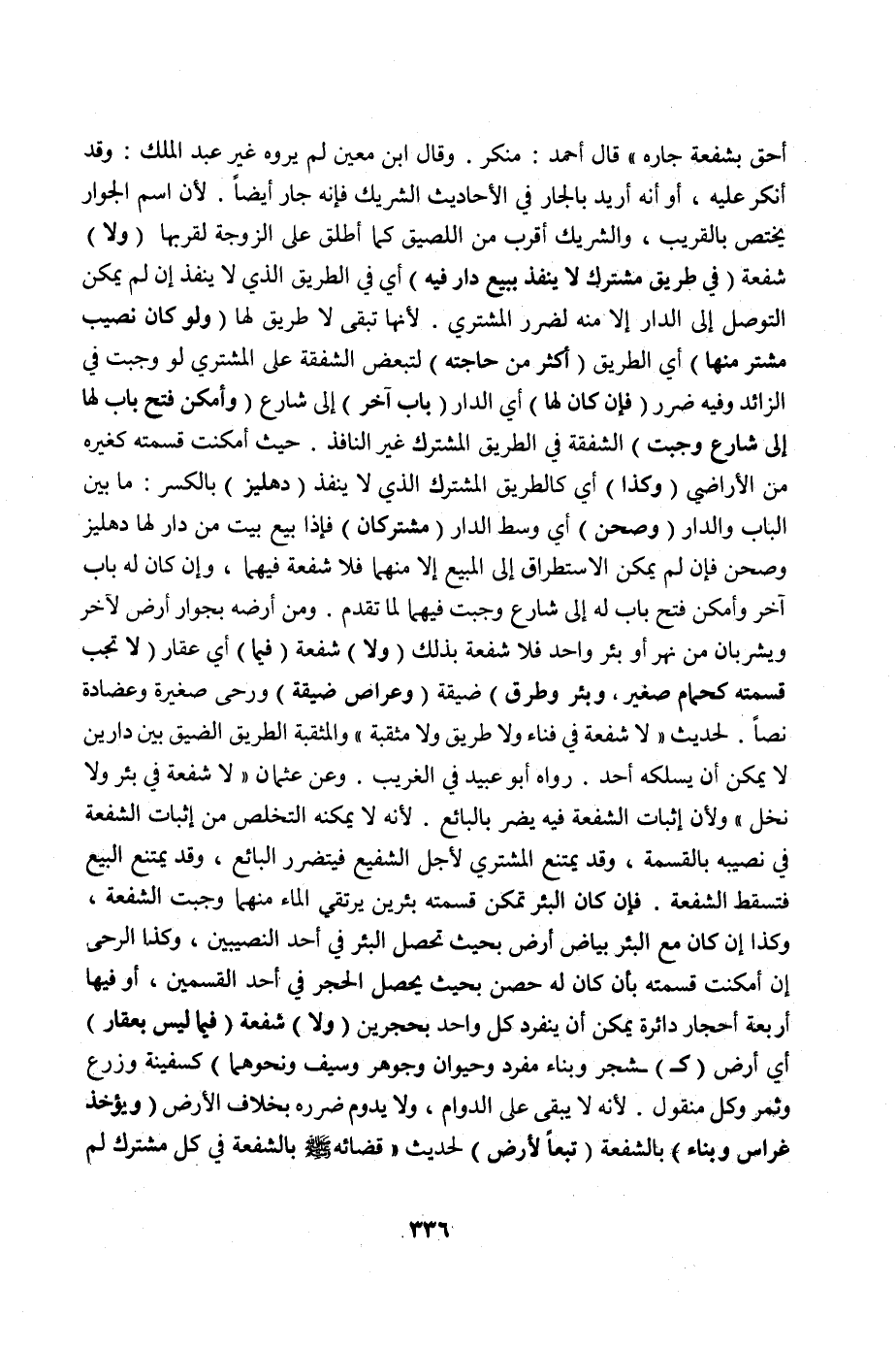 «الْجَارُ أَحَقُّ بِشُفْعَةِ جَارِهِ» " قَالَ أَحْمَدُ: مُنْكَرٌ. وَقَالَ ابْنُ مَعِينٍ: لَمْ يَرْوِهِ غَيْرُ عَبْدِ الْمَلِكِ: وَقَدْ أُنْكِرَ عَلَيْهِ، أَوْ أَنَّهُ أُرِيدَ بِالْجَارِ فِي الْأَحَادِيثِ الشَّرِيكُ فَإِنَّهُ جَارٌ أَيْضًا. ; لِأَنَّ اسْمَ الْجِوَارِ يَخْتَصُّ بِالْقَرِيبِ، وَالشَّرِيكُ أَقْرَبُ مِنْ اللَّصِيقِ كَمَا أُطْلِقَ عَلَى الزَّوْجَةِ لِقُرْبِهَا (وَلَا) شُفْعَةَ (فِي طَرِيقٍ مُشْتَرَكٍ لَا يَنْفُذُ بِبَيْعِ دَارٍ فِيهِ) أَيْ: فِي الطَّرِيقِ الَّذِي لَا يَنْفُذُ إنْ لَمْ يُمْكِنْ التَّوَصُّلُ إلَى الدَّارِ إلَّا مِنْهُ لِضَرَرِ الْمُشْتَرِي. لِأَنَّهَا تَبْقَى لَا طَرِيقَ لَهَا (وَلَوْ كَانَ نَصِيبُ مُشْتَرٍ مِنْهَا) أَيْ: الطَّرِيقِ (أَكْثَرَ مِنْ حَاجَتِهِ) لِتَبَعُّضِ الشُّفْعَةِ عَلَى الْمُشْتَرِي لَوْ وَجَبَتْ فِي الزَّائِدِ وَفِيهِ ضَرَرٌ، (فَإِنْ كَانَ لَهَا) أَيْ الدَّارِ (بَابٌ آخَرُ) إلَى شَارِعٍ (وَأَمْكَنَ فَتْحُ بَابٍ لَهَا إلَى شَارِعٍ وَجَبَتْ) الشُّفْعَةُ فِي الطَّرِيقِ الْمُشْتَرَكِ غَيْرِ النَّافِذِ. حَيْثُ أَمْكَنَتْ قِسْمَتُهُ كَغَيْرِهِ مِنْ الْأَرَاضِي (وَكَذَا) أَيْ: كَالطَّرِيقِ الْمُشْتَرَكِ الَّذِي لَا يَنْفُذُ (دِهْلِيزٌ) بِالْكَسْرِ: مَا بَيْنَ الْبَابِ وَالدَّارِ (وَصَحْنٌ) أَيْ: وَسَطُ الدَّارِ (مُشْتَرَكَانِ) ، فَإِذَا بِيعَ بَيْتٌ مِنْ دَارٍ لَهَا دِهْلِيزٌ وَصَحْنٌ فَإِنْ لَمْ يُمْكِنْ الِاسْتِطْرَاقُ إلَى الْمَبِيعِ إلَّا مِنْهُمَا فَلَا شُفْعَةَ فِيهِمَا، وَإِنْ كَانَ لَهُ بَابٌ آخَرُ وَأَمْكَنَ فَتْحُ بَابٍ لَهُ إلَى شَارِعٍ وَجَبَتْ فِيهِمَا لِمَا تَقَدَّمَ وَمَنْ أَرْضُهُ بِجِوَارِ أَرْضٍ لِآخَرَ وَيَشْرَبَانِ مِنْ نَهْرٍ أَوْ بِئْرٍ وَاحِدٍ فَلَا شُفْعَةَ بِذَلِكَ.