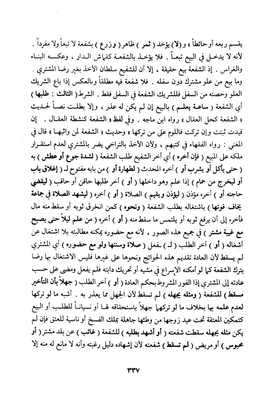 الشَّرْطُ (الثَّالِثُ: طَلَبُهَا) أَيْ: الشُّفْعَةِ (سَاعَةَ يَعْلَمُ) بِالْبَيْعِ إنْ لَمْ يَكُنْ لَهُ عُذْرٌ، وَإِلَّا بَطَلَتْ نَصًّا لِحَدِيثِ " «الشُّفْعَةُ كَحَلِّ الْعِقَالِ» " رَوَاهُ ابْنُ مَاجَهْ.