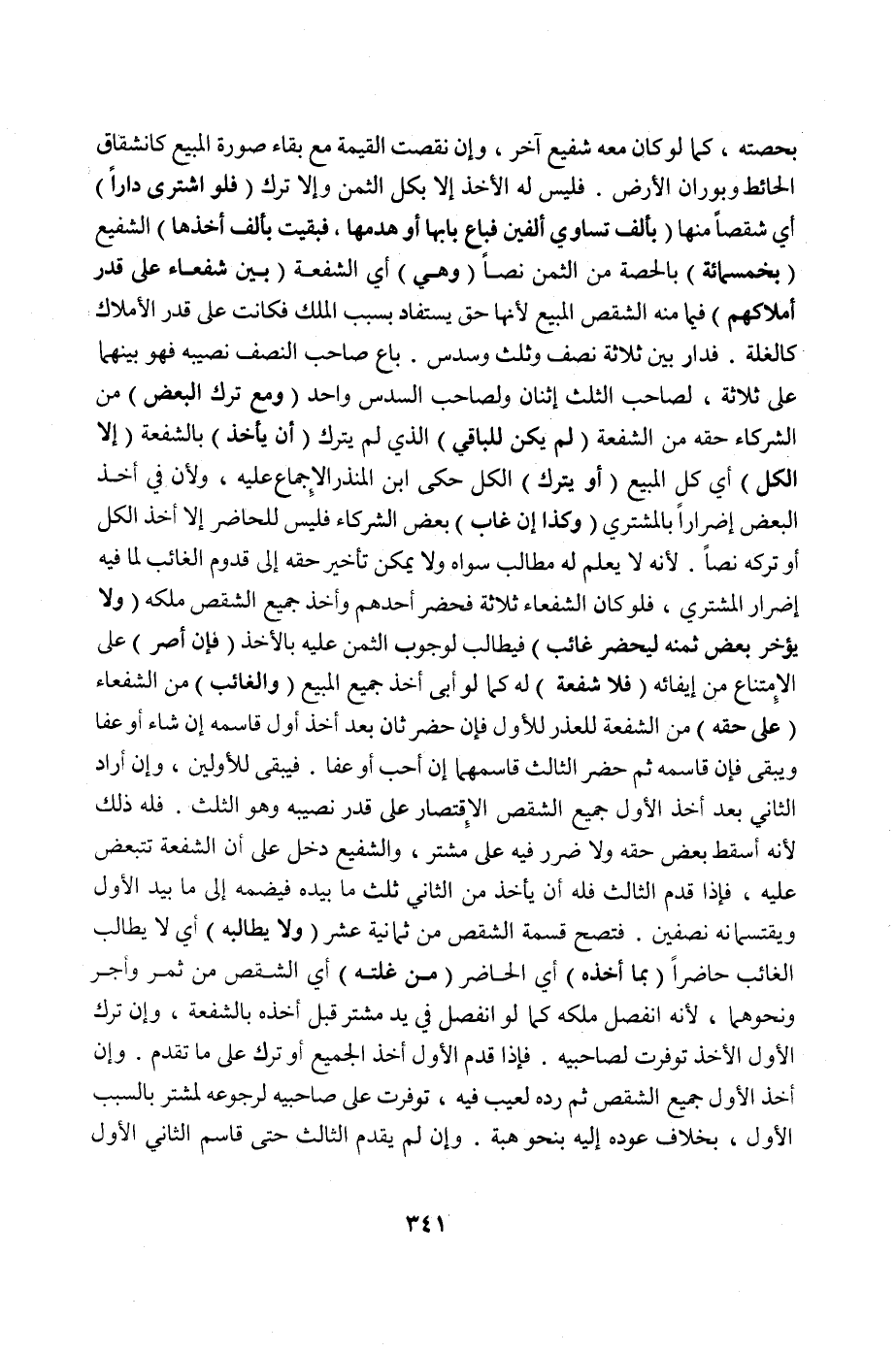 بِحِصَّتِهِ، كَمَا لَوْ كَانَ مَعَهُ شَفِيعٌ آخَرُ، وَإِنْ نَقَصَتْ الْقِيمَةُ مَعَ بَقَاءِ صُورَةِ الْمَبِيعِ كَانْشِقَاقِ الْحَائِطِ وَبَوَرَانِ الْأَرْضِ. فَلَيْسَ لَهُ الْأَخْذُ إلَّا بِكُلِّ الثَّمَنِ وَإِلَّا تَرَكَ (فَلَوْ اشْتَرَى دَارًا) أَيْ شِقْصًا مِنْهَا (بِأَلْفٍ تُسَاوِي أَلْفَيْنِ فَبَاعَ بَابَهَا أَوْ هَدَمَهَا، فَبَقِيَتْ بِأَلْفٍ أَخَذَهَا) الشَّفِيعُ (بِخَمْسِمِائَةٍ) بِالْحِصَّةِ مِنْ الثَّمَنِ نَصًّا (وَهِيَ) أَيْ: الشُّفْعَةُ (بَيْنَ شُفَعَاءَ عَلَى قَدْرِ أَمْلَاكِهِمْ) فِيمَا مِنْهُ الشِّقْصُ الْمَبِيعُ ; لِأَنَّهَا حَقٌّ يُسْتَفَادُ بِسَبَبِ الْمِلْكِ فَكَانَتْ عَلَى قَدْرِ الْأَمْلَاكِ كَالْغَلَّةِ. فَدَارٌ بَيْنَ ثَلَاثَةٍ نِصْفٌ وَثُلُثٌ وَسُدُسٌ. بَاعَ صَاحِبُ النِّصْفِ نَصِيبَهُ فَهُوَ بَيْنَهُمَا عَلَى ثَلَاثَةٍ، لِصَاحِبِ الثُّلُثِ اثْنَانِ وَلِصَاحِبِ السُّدُسِ وَاحِدٌ، (وَمَعَ تَرْكِ الْبَعْضِ) مِنْ الشُّرَكَاءِ حَقَّهُ مِنْ الشُّفْعَةِ (لَمْ يَكُنْ لِلْبَاقِي) الَّذِي لَمْ يَتْرُكْ (أَنْ يَأْخُذَ) بِالشُّفْعَةِ (إلَّا الْكُلَّ) أَيْ: كُلَّ الْمَبِيعِ (أَوْ يَتْرُكَ) الْكُلَّ حَكَى ابْنُ الْمُنْذِرِ الْإِجْمَاعَ عَلَيْهِ، وَلِأَنَّ فِي أَخْذِ الْبَعْضِ إضْرَارًا بِالْمُشْتَرِي، (وَكَذَا إنْ غَابَ) بَعْضُ الشُّرَكَاءِ فَلَيْسَ لِلْحَاضِرِ إلَّا أَخْذَ الْكُلِّ أَوْ تَرْكُهُ نَصًّا. لِأَنَّهُ لَا يُعْلَمُ لَهُ مُطَالِبٌ سِوَاهُ وَلَا يُمْكِنُ تَأْخِيرُ حَقِّهِ إلَى قُدُومِ الْغَائِبِ لِمَا فِيهِ إضْرَارُ الْمُشْتَرِي، فَلَوْ كَانَ الشُّفَعَاءُ ثَلَاثَةً فَحَضَرَ أَحَدُهُمْ وَأَخَذَ جَمِيعَ الشِّقْصِ مَلَكَهُ.