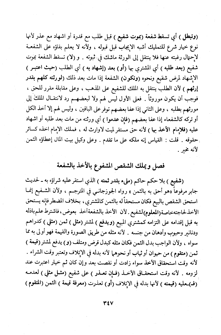 (فَصْلٌ وَيَمْلِكُ الشِّقْصَ الْمَشْفُوعَ بِالْأَخْذِ بِالشُّفْعَةِ) (شَفِيعٌ) بِلَا حُكْمِ حَاكِمٍ (مُلِئَ بِقَدْرِ ثَمَنِهِ) الَّذِي اسْتَقَرَّ عَلَيْهِ شِرَاؤُهُ بِهِ لِحَدِيثِ جَابِرٍ مَرْفُوعًا " هُوَ أَحَقُّ بِهِ بِالثَّمَنِ رَوَاهُ الْجُوزَجَانِيُّ فِي الْمُتَرْجَمِ، وَلِأَنَّ الشَّفِيعَ إنَّمَا اسْتَحَقَّ الشِّقْصَ بِالْبَيْعِ فَكَانَ مُسْتَحِقًّا لَهُ بِالثَّمَنِ كَالْمُشْتَرِي، بِخِلَافِ الْمُضْطَرِّ فَإِنَّهُ يَسْتَحِقُّ الْأَخْذُ لِحَاجَتِهِ خَاصَّةً (الْمَعْلُومِ) لِشَفِيعٍ. لِأَنَّ الْأَخْذَ بِالشُّفْعَةِ أَخْذٌ بِعِوَضٍ، فَاشْتُرِطَ عِلْمُ بَاذِلِهِ بِهِ قَبْلَ إقْدَامِهِ عَلَى الْتِزَامِهِ كَمُشْتَرِي الْمَبِيعِ (، وَيَدْفَعُ) لِمُشْتَرٍ (مِثْلَ) ثَمَنِ (مِثْلِيٍّ) كَدَرَاهِمَ وَدَنَانِيرَ وَحُبُوبٍ وَأَدْهَانٍ مِنْ جِنْسِهِ ; لِأَنَّهُ مِثْلُهُ مِنْ طَرِيقِ الصُّورَةِ وَالْقِيمَةِ فَهُوَ أَوْلَى بِهِ مِمَّا سِوَاهُ، وَلِأَنَّ الْوَاجِبَ بَدَلُ الثَّمَنِ فَكَانَ مِثْلُهُ كَبَدَلِ قَرْضٍ وَمُتْلَفٍ (وَ) يَدْفَعُ لِمُشْتَرٍ (قِيمَةَ) ثَمَنٍ (مُتَقَوِّمٍ) مِنْ حَيَوَانٍ أَوْ ثِيَابٍ أَوْ نَحْوِهِمَا ; لِأَنَّهُ بَدَلُهُ فِي الْإِتْلَافِ وَتُعْتَبَرُ وَقْتَ الشِّرَاءِ لِأَنَّهُ وَقْتُ اسْتِحْقَاقِ الْأَخْذِ سَوَاءٌ زَادَتْ أَوْ نَقَصَتْ بَعْدُ، وَإِنْ كَانَ ثَمَّ خِيَارٌ اُعْتُبِرَتْ عِنْدَ لُزُومِهِ. لِأَنَّهُ وَقْتُ اسْتِحْقَاقِ الْأَخْذِ، (فَإِنْ تَعَذَّرَ) عَلَى شَفِيعٍ (مِثْلُ مِثْلِيٍّ) لِعَدَمِهِ (فَ) عَلَيْهِ (قِيمَتُهُ) لِأَنَّهَا بَدَلُهُ فِي الْإِتْلَافِ (أَوْ) تَعَذَّرَتْ (مَعْرِفَةُ قِيمَةِ) الثَّمَنِ (الْمُتَقَوِّمِ)