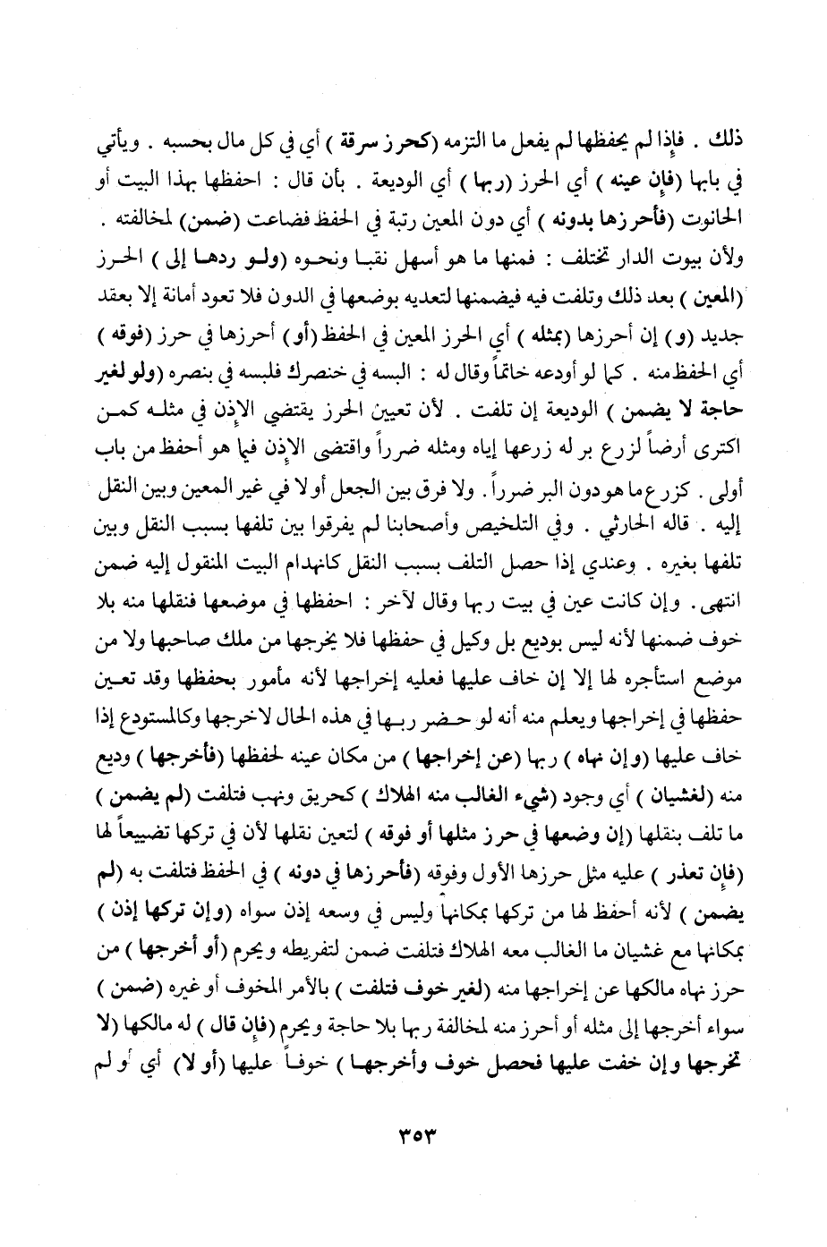 ذَلِكَ. فَإِذَا لَمْ يَحْفَظْهَا لَمْ يَفْعَلْ مَا الْتَزَمَهُ (كَحِرْزِ سَرِقَةٍ) أَيْ: فِي كُلِّ مَالٍ بِحَسْبِهِ. وَيَأْتِي فِي بَابِهَا (فَإِنْ عَيَّنَهُ) أَيْ: الْحِرْزَ (رَبُّهَا) أَيْ: الْوَدِيعَةِ. بِأَنْ قَالَ: احْفَظْهَا بِهَذَا الْبَيْتِ أَوْ الْحَانُوتِ (فَأَحْرَزَهَا بِدُونِهِ) أَيْ: دُونِ الْمُعَيَّنِ رُتْبَةً فِي الْحِفْظِ فَضَاعَتْ (ضَمِنَ) لِمُخَالَفَتِهِ. وَلِأَنَّ بُيُوتَ الدَّارِ تَخْتَلِفُ: فَمِنْهَا مَا هُوَ أَسْهَلُ نَقْبًا وَنَحْوُهُ، (وَلَوْ رَدَّهَا إلَى) الْحِرْزِ (الْمُعَيَّنِ) بَعْدَ ذَلِكَ وَتَلِفَتْ فِيهِ فَيَضْمَنُهَا لِتَعَدِّيهِ بِوَضْعِهَا فِي الدُّونِ فَلَا تَعُودُ أَمَانَةً إلَّا بِعَقْدٍ جَدِيدٍ.