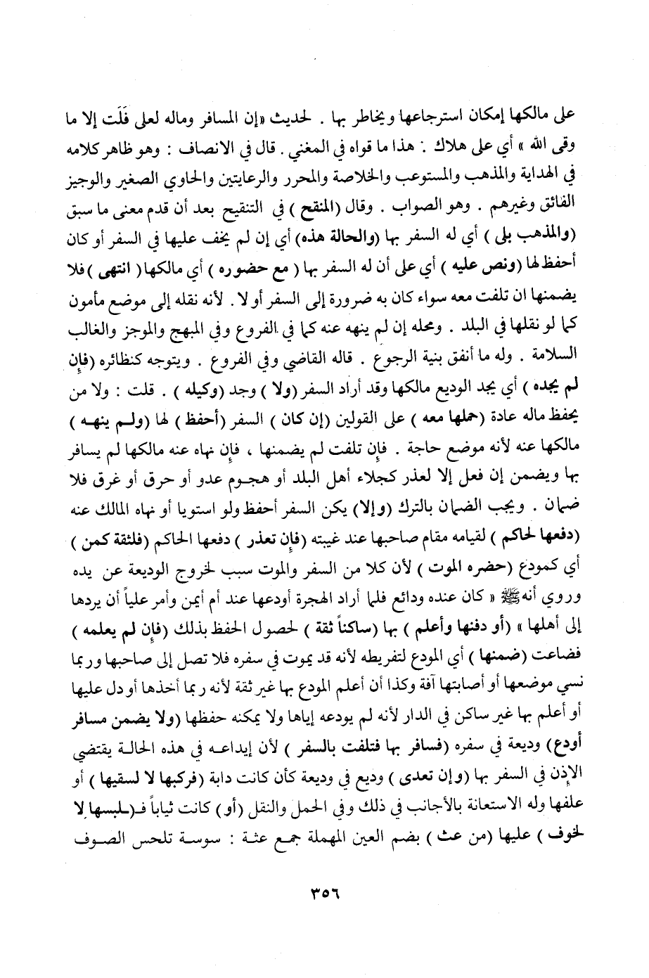 عَلَى مَالِكِهَا إمْكَانَ اسْتِرْجَاعِهَا وَيُخَاطِرُ بِهَا. لِحَدِيثِ " «إنَّ الْمُسَافِرَ وَمَالَهُ لَعَلَى فَلْتٍ إلَّا مَا وَقَى اللَّهُ» أَيْ: عَلَى هَلَاكٍ هَذَا مَا قَوَّاهُ فِي الْمُغْنِي قَالَ فِي الْإِنْصَافِ: وَهُوَ ظَاهِرُ كَلَامِهِ فِي الْهِدَايَةِ وَالْمَذْهَبِ وَالْمُسْتَوْعِبِ وَالْخُلَاصَةِ وَالْمُحَرَّرِ وَالرِّعَايَتَيْنِ وَالْحَاوِي الصَّغِيرِ وَالْوَجِيزِ الْفَائِقِ وَغَيْرِهِمْ. وَهُوَ الصَّوَابُ. وَقَالَ (الْمُنَقِّحُ) فِي التَّنْقِيحِ بَعْدَ أَنْ قَدَّمَ مَعْنَى مَا سَبَقَ: (وَالْمَذْهَبُ بَلَى) أَيْ: لَهُ السَّفَرُ بِهَا (وَالْحَالَةُ هَذِهِ) أَيْ: إنْ لَمْ يَخَفْ عَلَيْهَا فِي السَّفَرِ أَوْ كَانَ أَحْفَظَ لَهَا (وَنَصَّ عَلَيْهِ) أَيْ: عَلَى أَنَّ لَهُ السَّفَرَ بِهَا (مَعَ حُضُورِهِ) أَيْ: مَالِكِهَا (انْتَهَى) ، فَلَا يَضْمَنُهَا إنْ تَلِفَتْ مَعَهُ، سَوَاءٌ كَانَ بِهِ ضَرُورَةٌ إلَى السَّفَرِ أَوْ لَا ; لِأَنَّهُ نَقَلَهُ إلَى مَوْضِعٍ مَأْمُونٍ كَمَا لَوْ نَقَلَهَا فِي الْبَلَدِ. وَمَحِلُّهُ إنْ لَمْ يَنْهَهُ عَنْهُ كَمَا فِي الْفُرُوعِ.