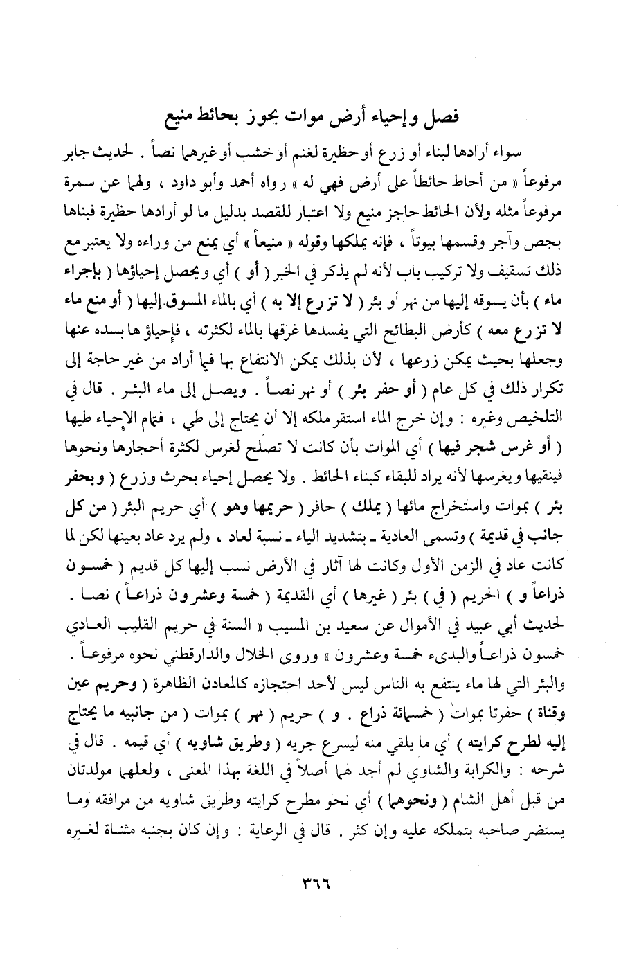 سَوَاءٌ أَرَادَهَا لِبِنَاءٍ أَوْ زَرْعٍ أَوْ حَظِيرَةٍ لِغَنَمٍ أَوْ خَشَبٍ أَوْ غَيْرِهِمَا نَصًّا. لِحَدِيثِ جَابِرٍ مَرْفُوعًا «مَنْ أَحَاطَ حَائِطًا عَلَى أَرْضٍ فَهِيَ لَهُ» رَوَاهُ أَحْمَدُ وَأَبُو دَاوُد، وَلَهُمَا عَنْ سَمُرَةَ مَرْفُوعًا مِثْلُهُ ; وَلِأَنَّ الْحَائِطَ حَاجِزٌ مَنِيعٌ وَلَا اعْتِبَارَ لِلْقَصْدِ بِدَلِيلِ مَا لَوْ أَرَادَهَا حَظِيرَةً فَبَنَاهَا بِجِصٍّ وَآجُرٍّ وَقَسَّمَهَا بُيُوتًا، فَإِنَّهُ يَمْلِكُهَا وَقَوْلُهُ: " مَنِيعًا " أَيْ: يَمْنَعُ مَنْ وَرَاءَهُ وَلَا يُعْتَبَرُ مَعَ ذَلِكَ تَسْقِيفٌ وَلَا تَرْكِيبُ بَابٍ ; لِأَنَّهُ لَمْ يُذْكَرْ فِي الْخَبَرِ (أَوْ) أَيْ: وَيَحْصُلُ إحْيَاؤُهَا (بِإِجْرَاءِ مَاءٍ) بِأَنْ يَسُوقَهُ إلَيْهَا مِنْ نَهْرٍ أَوْ بِئْرٍ (لَا تُزْرَعُ إلَّا بِهِ) أَيْ: بِالْمَاءِ الْمَسُوقِ إلَيْهَا (أَوْ مَنْعِ مَاءٍ لَا تُزْرَعُ مَعَهُ) كَأَرْضِ الْبَطَائِحِ الَّتِي يُفْسِدُهَا غَرَقُهَا بِالْمَاءِ لِكَثْرَتِهِ، فَإِحْيَاؤُهَا بِسَدِّهِ عَنْهَا وَجَعْلِهَا بِحَيْثُ يُمْكِنُ زَرْعُهَا ; لِأَنَّ بِذَلِكَ يُمْكِنُ الِانْتِفَاعُ بِهَا فِيمَا أَرَادَ مِنْ غَيْرِ حَاجَةٍ إلَى تَكْرَارِ ذَلِكَ فِي كُلِّ عَامٍ (أَوْ حَفْرِ بِئْرٍ) أَوْ نَهْرٍ نَصًّا. وَيَصِلُ إلَى مَاءِ الْبِئْرِ. قَالَ فِي التَّلْخِيصِ وَغَيْرِهِ: وَإِنْ خَرَجَ الْمَاءُ اسْتَقَرَّ مِلْكُهُ إلَّا أَنْ يَحْتَاجَ إلَى طَيٍّ، فَتَمَامُ الْإِحْيَاءِ طَيُّهَا (أَوْ غَرْسُ شَجَرٍ فِيهَا) أَيْ: الْمَوَاتِ بِأَنْ كَانَتْ لَا تَصْلُحُ لِغَرْسٍ لِكَثْرَةِ أَحْجَارِهَا وَنَحْوِهَا فَيُنَقِّيهَا وَيَغْرِسُهَا ; لِأَنَّهُ يُرَادُ لِلْبَقَاءِ كَبِنَاءِ الْحَائِطِ. وَلَا يَحْصُلُ إحْيَاءٌ بِحَرْثٍ وَزَرْعٍ.