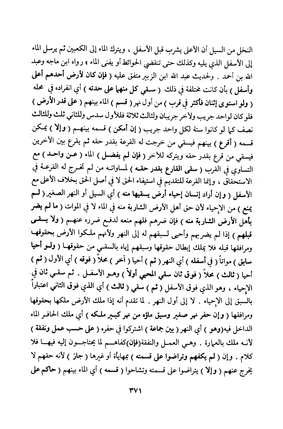 «أَنَّ النَّبِيَّ صَلَّى اللَّهُ عَلَيْهِ وَسَلَّمَ قَضَى فِي شُرْبِ النَّخْلِ مِنْ السَّيْلِ أَنَّ الْأَعْلَى يَشْرَبُ قَبْلَ الْأَسْفَلِ، وَيَتْرُكُ الْمَاءَ إلَى الْكَعْبَيْنِ ثُمَّ يُرْسِلُ الْمَاءَ إلَى الْأَسْفَلِ الَّذِي يَلِيهِ وَكَذَلِكَ حَتَّى تَنْقَضِيَ الْحَوَائِطُ أَوْ يَفْنَى الْمَاءُ» رَوَاهُ ابْنُ مَاجَهْ وَعَبْدُ اللَّهِ بْنُ أَحْمَدَ. وَلِحَدِيثِ عَبْدِ اللَّهِ بْنِ الزُّبَيْرِ مُتَّفَقٌ عَلَيْهِ (فَإِنْ كَانَ لِأَرْضِ أَحَدِهِمْ أَعْلَى وَأَسْفَلُ) بِأَنْ كَانَتْ مُخْتَلِفَةً فِي ذَلِكَ (سُقِيَ كُلٌّ مِنْهُمَا عَلَى حِدَتِهِ) أَيْ: انْفِرَادِهِ فِي مَحِلِّهِ، (وَلَوْ اسْتَوَى اثْنَانِ فَأَكْثَرُ فِي قُرْبٍ) مِنْ أَوَّلِ نَهْرٍ (قُسِّمَ) الْمَاءُ بَيْنَهُمْ (عَلَى قَدْرِ الْأَرْضِ) فَلَوْ كَانَ لِوَاحِدٍ جَرِيبٌ وَلِآخَرَ جَرِيبَانِ وَلِثَالِثٍ ثَلَاثَةٌ، فَلِلْأَوَّلِ سُدُسٌ وَلِلثَّانِي ثُلُثٌ وَلِلثَّالِثِ نِصْفٌ كَمَا لَوْ كَانُوا سِتَّةً لِكُلِّ وَاحِدٍ جَرِيبٌ، (إنْ أَمْكَنَ) قَسْمُهُ بَيْنَهُمْ (وَإِلَّا) يُمْكِنُ قَسْمُهُ (أُقْرِعَ) بَيْنَهُمْ فَيَسْقِي مَنْ خَرَجَتْ لَهُ الْقُرْعَةُ بِقَدْرِ حَقِّهِ ثُمَّ يُقْرَعُ بَيْنَ الْآخَرِينَ فَيَسْقِي مِنْ قُرِعَ بِقَدْرِ حَقِّهِ وَيَتْرُكُهُ لِلْآخَرِ، (فَإِنْ لَمْ يَفْضُلْ) الْمَاءُ (عَنْ وَاحِدٍ) مَعَ التَّسَاوِي فِي الْقُرْبِ (سَقَى الْقَارِعُ بِقَدْرِ حَقِّهِ) لِمُسَاوَاتِهِ مَنْ لَمْ تَخْرُجْ لَهُ الْقُرْعَةُ فِي الِاسْتِحْقَاقِ، وَإِنَّمَا الْقُرْعَةُ لِلتَّقْدِيمِ فِي اسْتِيفَاءِ الْحَقِّ لَا فِي أَصْلِ الْحَقِّ بِخِلَافِ الْأَعْلَى مَعَ الْأَسْفَلِ
