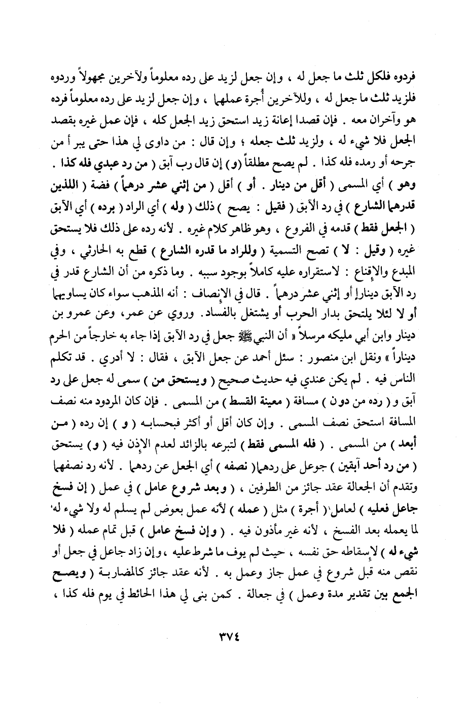وَفِي الْمُبْدِعِ وَالْإِقْنَاعِ: لِاسْتِقْرَارِهِ عَلَيْهِ كَامِلًا بِوُجُودِ سَبَبِهِ. وَمَا ذَكَرَهُ مِنْ أَنَّ الشَّارِعَ قَدَّرَ فِي رَدِّ الْآبِقِ دِينَارًا أَوْ اثْنَيْ عَشَرَ دِرْهَمًا. قَالَ فِي الْإِنْصَافِ: إنَّهُ الْمَذْهَبُ سَوَاءٌ كَانَ يُسَاوِيهِمَا أَوْ لَا لِئَلَّا يَلْتَحِقَ بِدَارِ الْحَرْبِ أَوْ يَشْتَغِلَ بِالْفَسَادِ. وَرُوِيَ عَنْ عُمَرَ، وَعَنْ عَمْرِو بْنِ دِينَارٍ وَابْنِ أَبِي مُلَيْكَةَ مُرْسَلًا «أَنَّ النَّبِيَّ صَلَّى اللَّهُ عَلَيْهِ وَسَلَّمَ جَعَلَ فِي رَدِّ الْآبِقِ إذَا جَاءَ بِهِ خَارِجًا مِنْ الْحَرَمِ دِينَارًا» وَنَقَلَ ابْنُ مَنْصُورٍ: سُئِلَ أَحْمَدُ عَنْ جُعْلِ الْآبِقِ، فَقَالَ: لَا أَدْرِي. قَدْ تَكَلَّمَ النَّاسُ فِيهِ. لَمْ يَكُنْ عِنْدِي فِيهِ حَدِيثٌ صَحِيحٌ