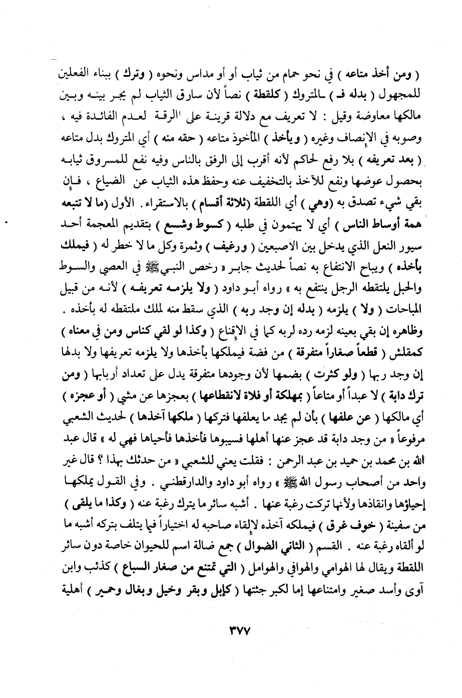 (وَهِيَ) أَيْ: اللُّقَطَةُ (ثَلَاثَةُ أَقْسَامٍ) بِالِاسْتِقْرَاءِ: الْأَوَّلُ (مَا لَا تَتْبَعُهُ هِمَّةُ أَوْسَاطِ النَّاسِ) أَيْ: لَا يَهْتَمُّونَ فِي طَلَبِهِ (كَسَوْطٍ وَشِسْعٍ) بِتَقْدِيمِ الْمُعْجَمَةِ أَحَدُ سُيُورِ النَّعْلِ الَّذِي يَدْخُلُ بَيْنَ الْأُصْبُعَيْنِ (وَرَغِيفٍ) وَثَمَرَةٍ وَكُلِّ مَا لَا خَطَرَ لَهُ (فَيُمْلَكُ بِأَخْذِهِ) وَيُبَاحُ الِانْتِفَاعُ بِهِ نَصًّا لِحَدِيثِ جَابِرٍ «رَخَّصَ النَّبِيُّ صَلَّى اللَّهُ عَلَيْهِ وَسَلَّمَ فِي الْعِصِيِّ وَالسَّوْطِ وَالْحَبْلِ يَلْتَقِطُهُ الرَّجُلُ يَنْتَفِعُ بِهِ» رَوَاهُ أَبُو دَاوُد (وَلَا يَلْزَمُهُ تَعْرِيفُهُ) لِأَنَّهُ مِنْ قَبِيلِ الْمُبَاحَاتِ (وَلَا) يَلْزَمُهُ (بَدَلُهُ إنْ وَجَدَ رَبَّهُ) الَّذِي سَقَطَ مِنْهُ لِمِلْكِ مُلْتَقِطِهِ لَهُ بِأَخْذِهِ. وَظَاهِرُهُ إنْ بَقِيَ بِعَيْنِهِ لَزِمَهُ رَدُّهُ لِرَبِّهِ كَمَا فِي الْإِقْنَاعِ (وَكَذَا لَوْ لَقِيَ كَنَّاسٌ وَمَنْ فِي مَعْنَاهُ) كَمُقْلِشٍ (قِطَعًا صِغَارًا مُتَفَرِّقَةً) مِنْ فِضَّةٍ فَيَمْلِكُهَا بِأَخْذِهَا وَلَا يَلْزَمُهُ تَعْرِيفُهَا وَلَا بَدَلُهَا إنْ وَجَدَ رَبَّهَا (وَلَوْ كَثُرَتْ) بِضَمِّهَا لِأَنَّ وُجُودَهَا مُتَفَرِّقَةً يَدُلُّ عَلَى تَعْدَادِ أَرْبَابِهَا (وَمَنْ تَرَكَ دَابَّةً) لَا عَبْدًا أَوْ مَتَاعًا (بِمَهْلَكَةٍ أَوْ فَلَاةٍ لِانْقِطَاعِهَا) بِعَجْزِهَا عَنْ مَشْيٍ (أَوْ عَجْزِهِ) أَيْ: مَالِكِهَا (عَنْ عَلَفِهَا) بِأَنْ لَمْ يَجِدْ مَا يَعْلِفُهَا فَتَرَكَهَا (مَلَكَهَا آخِذُهَا) لِحَدِيثِ الشَّعْبِيِّ مَرْفُوعًا «مَنْ وَجَدَ دَابَّةً قَدْ عَجَزَ عَنْهَا أَهْلُهَا فَسَيَّبُوهَا فَأَخَذَهَا فَأَحْيَاهَا فَهِيَ لَهُ» قَالَ عَبْدُ اللَّهِ بْنُ مُحَمَّدِ بْنِ حُمَيْدٍ بْنِ عَبْدِ الرَّحْمَنِ: فَقُلْتُ يَعْنِي لِلشَّعْبِيِّ " مَنْ حَدَّثَكَ بِهَذَا؟ قَالَ غَيْرُ وَاحِدٍ مِنْ أَصْحَابِ رَسُولِ اللَّهِ صَلَّى اللَّهُ عَلَيْهِ وَسَلَّمَ " رَوَاهُ أَبُو دَاوُد وَالدَّارَقُطْنِيّ. وَفِي الْقَوْلِ يَمْلِكُهَا إحْيَاؤُهَا وَإِنْقَاذُهَا وَلِأَنَّهَا تُرِكَتْ رَغْبَةً عَنْهَا. أَشْبَهَ سَائِرَ مَا يُتْرَكُ رَغْبَةً عَنْهُ (وَكَذَا مَا يُلْقَى) مِنْ سَفِينَةٍ (خَوْفَ غَرَقٍ) فَيَمْلِكُهُ آخِذُهُ لِإِلْقَاءِ صَاحِبِهِ لَهُ اخْتِيَارًا فِيمَا يَتْلَفُ بِتَرْكِهِ أَشْبَهَ مَا لَوْ أَلْقَاهُ رَغْبَةً عَنْهُ. الْقِسْمُ (الثَّانِي: الضَّوَالُّ) جَمْعُ ضَالَّةٍ اسْمٌ لِلْحَيَوَانِ خَاصَّةً دُونَ سَائِرِ اللُّقَطَةِ وَيُقَالُ لَهَا: الَهَوَامِي وَالْهَوَافِي وَالْهَوَامِلُ (الَّتِي تَمْتَنِعُ مِنْ صِغَارِ السِّبَاعِ) كَذِئْبٍ وَابْنِ آوَى وَأَسَدٍ صَغِيرٍ وَامْتِنَاعِهَا إمَّا لِكِبَرِ جُثَّتِهَا (كَإِبِلٍ وَبَقَرٍ وَخَيْلٍ وَبِغَالٍ وَحَمِيرٍ) أَهْلِيَّةٍ