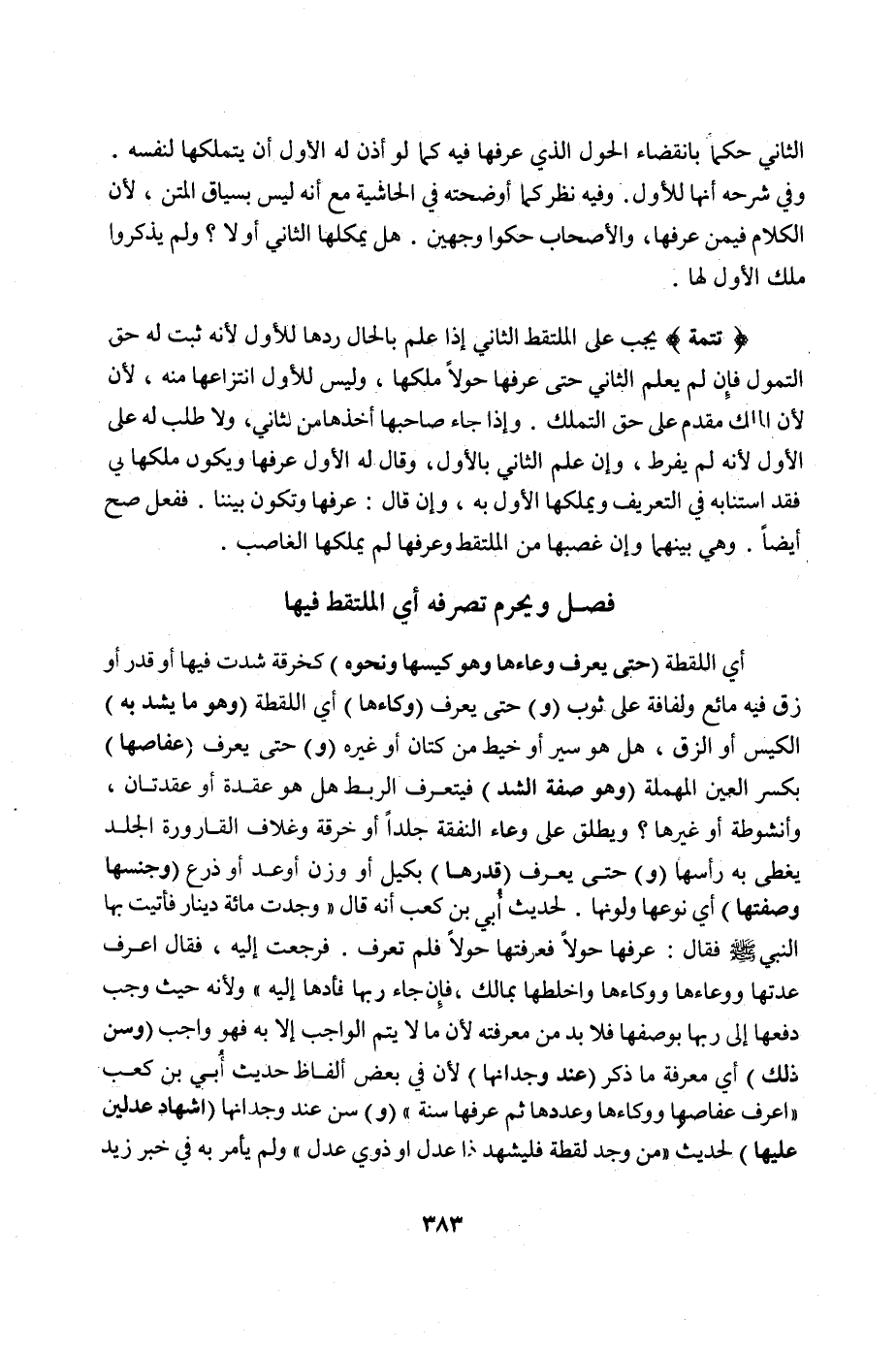 (فَصْلٌ وَيَحْرُمُ تَصَرُّفُهُ) أَيْ: الْمُلْتَقِطِ (فِيهَا) أَيْ: اللُّقَطَةِ (حَتَّى يُعَرِّفَ وِعَاءَهَا وَهُوَ كِيسُهَا وَنَحْوُهُ) كَخِرْقَةٍ شُدَّتْ فِيهَا أَوْ قِدْرٍ أَوْ زِقٍّ فِيهِ مَائِعٌ وَلِفَافَةٍ عَلَى ثَوْبٍ (وَ) حَتَّى يُعَرِّفَ (وِكَاءَهَا) أَيْ اللُّقَطَةِ (وَهُوَ مَا يُشَدُّ بِهِ) الْكِيسُ أَوْ الزِّقُّ، هَلْ هُوَ سَيْرٌ أَوْ خَيْطٌ مِنْ كَتَّانٍ أَوْ غَيْرِهِ (وَ) حَتَّى يُعَرِّفَ (عِفَاصَهَا) بِكَسْرِ الْعَيْنِ الْمُهْمَلَةِ (وَهُوَ صِفَةُ الشَّدِّ) فَيُتَعَرَّفُ الرَّبْطُ هَلْ هُوَ عُقْدَةٌ أَوْ عُقْدَتَانِ، وَأُنْشُوطَةٌ أَوْ غَيْرُهَا؟ وَيُطْلَقُ عَلَى وِعَاءِ النَّفَقَةِ جِلْدًا أَوْ خِرْقَةً وَغُلَافِ الْقَارُورَةِ الْجِلْدُ يُغَطَّى بِهِ رَأْسُهَا (وَ) حَتَّى يَعْرِفَ (قَدْرَهَا) بِكَيْلٍ أَوْ وَزْنٍ أَوْ عَدٍّ أَوْ ذَرْعٍ (وَجِنْسَهَا وَصِفَتَهَا) أَيْ: نَوْعَهَا وَلَوْنَهَا. لِحَدِيثِ أُبَيِّ بْنِ كَعْبٍ أَنَّهُ قَالَ «وَجَدْتُ مِائَةَ دِينَارٍ فَأَتَيْتُ بِهَا النَّبِيَّ صَلَّى اللَّهُ عَلَيْهِ وَسَلَّمَ فَقَالَ: عَرِّفْهَا حَوْلًا فَعَرَّفْتُهَا حَوْلًا فَلَمْ تُعْرَفْ، فَرَجَعْتُ إلَيْهِ، فَقَالَ اعْرِفْ عِدَّتَهَا وَوِعَاءَهَا وَوِكَاءَهَا وَاخْلِطْهَا بِمَالِكَ، فَإِنْ جَاءَ رَبُّهَا فَأَدِّهَا إلَيْهِ» وَلِأَنَّهُ حَيْثُ وَجَبَ دَفْعُهَا إلَى رَبِّهَا بِوَصْفِهَا فَلَا بُدَّ مِنْ مَعْرِفَتِهِ ; لِأَنَّ مَا لَا يَتِمُّ الْوَاجِبُ إلَّا بِهِ فَهُوَ وَاجِبٌ. (وَسُنَّ ذَلِكَ) أَيْ: مَعْرِفَةُ مَا ذَكَرَ (عِنْدَ وُجْدَانِهَا) ; لِأَنَّ فِي بَعْضِ أَلْفَاظِ حَدِيثِ أُبَيِّ بْنِ كَعْبٍ «اعْرِفْ عِفَاصَهَا وَوِكَاءَهَا وَعَدَدَهَا ثُمَّ عَرِّفْهَا سَنَةً»