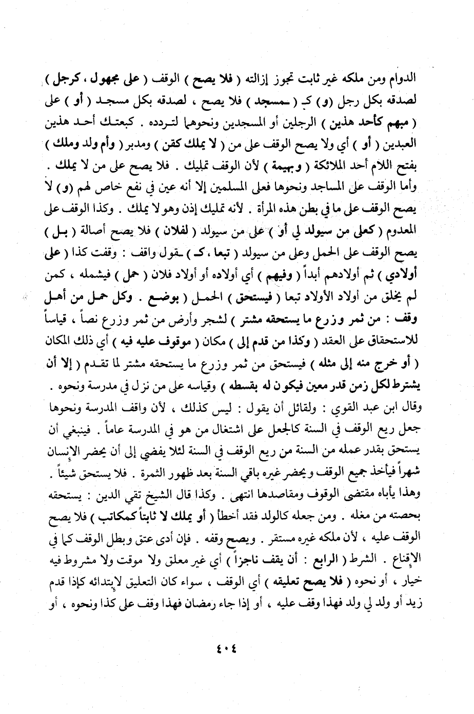 (وَ) لَا يَصِحُّ الْوَقْفُ عَلَى مَا فِي بَطْنِ هَذِهِ الْمَرْأَةِ. لِأَنَّهُ تَمْلِيكُ إذْنٍ وَهُوَ لَا يَمْلِكُ. وَكَذَا الْوَقْفُ عَلَى الْمَعْدُومِ (كَعَلَى مَنْ سَيُولَدُ لِي أَوْ) عَلَى مَنْ سَيُولَدُ (لِفُلَانٍ) فَلَا يَصِحُّ أَصَالَةً (بَلْ) يَصِحُّ الْوَقْفُ عَلَى الْحَمْلِ وَعَلَى مَنْ سَيُولَدُ (تَبَعًا، كَ) قَوْلِ وَاقِفٍ: وَقَفْتُ كَذَا (عَلَى أَوْلَادِي) ثُمَّ أَوْلَادِهِمْ أَبَدًا (وَفِيهِمْ) أَيْ أَوْلَادِهِ أَوْ أَوْلَادِ فُلَانٍ (حَمْلٌ) فَيَشْمَلُهُ، كَمَنْ لَمْ يُخْلَقْ مِنْ أَوْلَادِ الْأَوْلَادِ تَبَعًا (فَيَسْتَحِقُّ) الْحَمْلُ (بِوَضْعٍ. وَكُلُّ حَمْلٍ مِنْ أَهْلِ وَقْفٍ: مِنْ ثَمَرِ وَزَرْعِ مَا يَسْتَحِقُّهُ مُشْتَرٍ) لِشَجَرٍ وَأَرْضٍ مِنْ ثَمَرٍ وَزَرْعٍ نَصًّا، قِيَاسًا لِلِاسْتِحْقَاقِ عَلَى الْعَقْدِ (وَكَذَا مَنْ قَدِمَ إلَى) مَكَان (مَوْقُوفٍ عَلَيْهِ فِيهِ) أَيْ ذَلِكَ الْمَكَانِ (أَوْ خَرَجَ مِنْهُ إلَى مِثْلِهِ) فَيَسْتَحِقُّ مِنْ ثَمَرِ وَزَرْعِ مَا يَسْتَحِقُّهُ مُشْتَرٍ لِمَا تَقَدَّمَ (إلَّا أَنْ يُشْتَرَطَ لِكُلِّ زَمَنٍ قَدْرٌ مُعَيَّنٌ فَيَكُونُ لَهُ بِقِسْطِهِ) وَقِيَاسُهُ عَلَى مَنْ نَزَلَ فِي مَدْرَسَةٍ وَنَحْوِهِ. وَقَالَ ابْنُ عَبْدِ الْقَوِيِّ: وَلِقَائِلٍ أَنْ يَقُولَ: لَيْسَ كَذَلِكَ، لِأَنَّ وَاقِفَ الْمَدْرَسَةِ وَنَحْوِهَا جَعَلَ رِيعَ الْوَقْفِ فِي السَّنَةِ كَالْجُعْلِ عَلَى اشْتِغَالِ مَنْ هُوَ فِي الْمَدْرَسَةِ عَامًا. فَيَنْبَغِي أَنْ يَسْتَحِقَّ بِقَدْرِ عَمَلِهِ مِنْ السَّنَةِ مِنْ رِيعِ الْوَقْفِ فِي السَّنَةِ لِئَلَّا يُفْضِيَ إلَى أَنْ يَحْضُرَ الْإِنْسَانُ شَهْرًا فَيَأْخُذَ جَمِيعَ الْوَقْفِ وَيَحْضُرَ غَيْرُهُ بَاقِي السَّنَةِ بَعْدَ ظُهُورِ الثَّمَرَةِ. فَلَا يَسْتَحِقُّ شَيْئًا. وَهَذَا يَأْبَاهُ مُقْتَضَى الْوُقُوفِ وَمَقَاصِدِهَا انْتَهَى. وَكَذَا قَالَ الشَّيْخُ تَقِيُّ الدِّينِ: يَسْتَحِقُّهُ بِحِصَّتِهِ مِنْ مَغَلِّهِ. وَمَنْ جَعَلَهُ كَالْوَلَدِ فَقَدْ أَخْطَأَ (أَوْ يَمْلِكُ لَا ثَابِتًا كَمُكَاتَبٍ) فَلَا يَصِحُّ الْوَقْفُ عَلَيْهِ، لِأَنَّ مِلْكَهُ غَيْرُ مُسْتَقِرٍّ. وَيَصِحُّ وَقْفُهُ. فَإِنْ أَدَّى عَتَقَ وَبَطَلَ الْوَقْفُ كَمَا فِي الْإِقْنَاعِ.