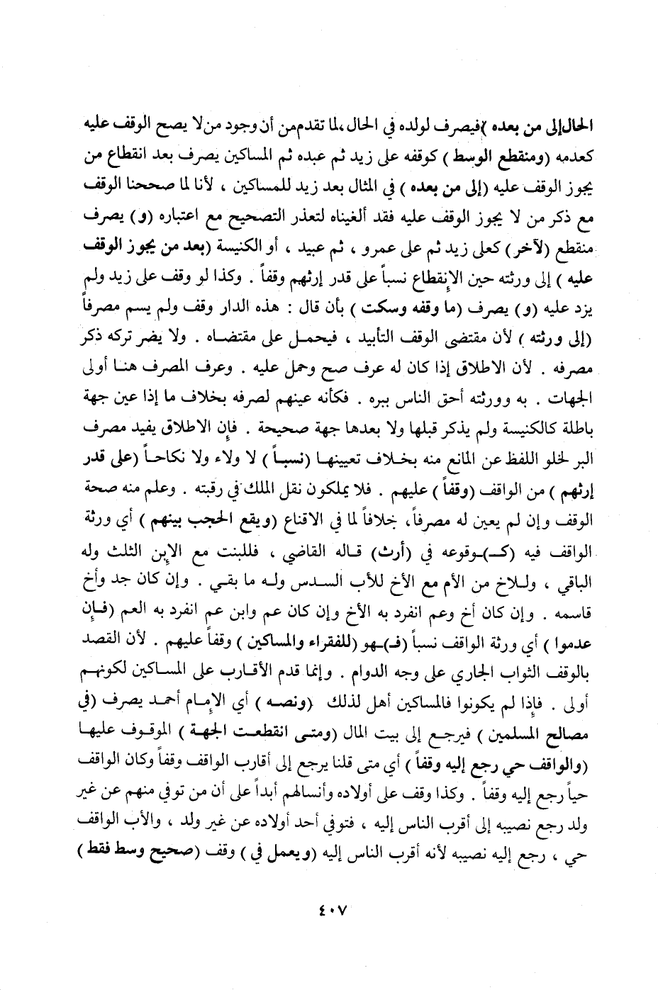 الْحَالِ إلَى مَنْ بَعْدَهُ) فَيُصْرَفُ لِوَالِدِهِ فِي الْحَالِ، لِمَا تَقَدَّمَ مِنْ أَنَّ وُجُودَ مَنْ لَا يَصِحُّ الْوَقْفُ عَلَيْهِ كَعَدَمِهِ (وَمُنْقَطِعُ الْوَسَطِ) كَوَقْفِهِ عَلَى زَيْدٍ ثُمَّ عَبْدِهِ ثُمَّ الْمَسَاكِينِ يُصْرَفُ بَعْدَ انْقِطَاعِ مَنْ يَجُوزُ الْوَقْفُ عَلَيْهِ (إلَى مَنْ بَعْدَهُ) فِي الْمِثَالِ بَعْدَ زَيْدٍ لِلْمَسَاكِينِ، لِأَنَّا لَمَّا صَحَّحْنَا الْوَقْفَ مَعَ ذِكْرِ مَنْ لَا يَجُوزُ الْوَقْفُ عَلَيْهِ فَقَدْ أَلْغَيْنَاهُ لِتَعَذُّرِ التَّصْحِيحِ مَعَ اعْتِبَارِهِ (وَ) يَنْصَرِفُ مُنْقَطِعٌ (لِآخَرَ) كَعَلَى زَيْدٍ ثُمَّ عَلَى عَمْرٍو، ثُمَّ عُبَيْدٍ، أَوْ الْكَنِيسَةِ (بَعْدَ مَنْ يَجُوزُ الْوَقْفُ عَلَيْهِ) إلَى وَرَثَتِهِ حِينَ الِانْقِطَاعِ نَسَبًا عَلَى قَدْرِ إرْثِهِمْ وَقْفًا وَكَذَا لَوْ وَقَفَ عَلَى زَيْدٍ وَلَمْ يَزِدْ عَلَيْهِ.