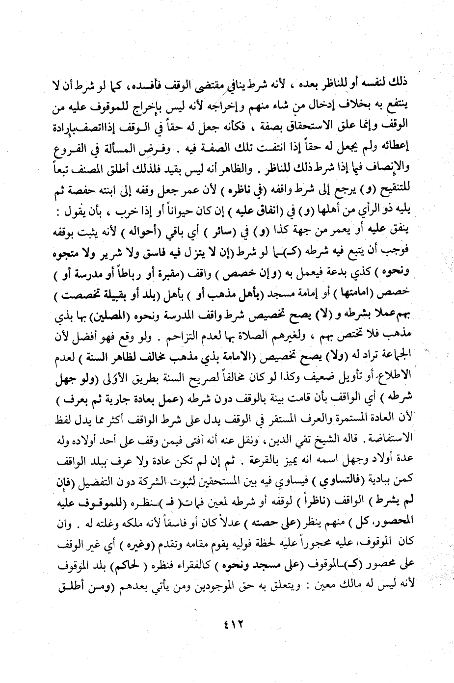 (وَإِنْ خَصَّصَ) وَاقِفٌ (مَقْبَرَةً أَوْ رِبَاطًا أَوْ مَدْرَسَةً أَوْ) خَصَّصَ (إمَامَتَهَا) أَوْ إمَامَةَ مَسْجِدٍ (بِأَهْلِ مَذْهَبٍ أَوْ) بِأَهْلِ (بَلَدٍ أَوْ بِقَبِيلَةٍ تَخَصَّصَتْ) بِهِمْ عَمَلًا بِشَرْطِهِ وَ (لَا) يَصِحُّ تَخْصِيصُ شَرْطِ وَاقِفِ الْمَدْرَسَةِ وَنَحْوِهِ (الْمُصَلِّينَ) بِهَا بِذِي مَذْهَبٍ فَلَا تَخْتَصُّ بِهِمْ، وَلِغَيْرِهِمْ الصَّلَاةُ بِهَا لِعَدَمِ التَّزَاحُمِ. وَلَوْ وَقَعَ فَهُوَ أَفْضَلُ لِأَنَّ الْجَمَاعَةَ تُرَادُ لَهُ (وَلَا) يَصِحُّ تَخْصِيصُ (الْإِمَامَةِ بِذِي مَذْهَبٍ مُخَالِفٍ لِظَاهِرِ السُّنَّةِ) لِعَدَمِ الِاطِّلَاعِ أَوْ تَأْوِيلٍ ضَعِيفٍ وَكَذَا لَوْ كَانَ مُخَالِفًا لِصَرِيحِ السُّنَّةِ بِطَرِيقِ الْأَوْلَى