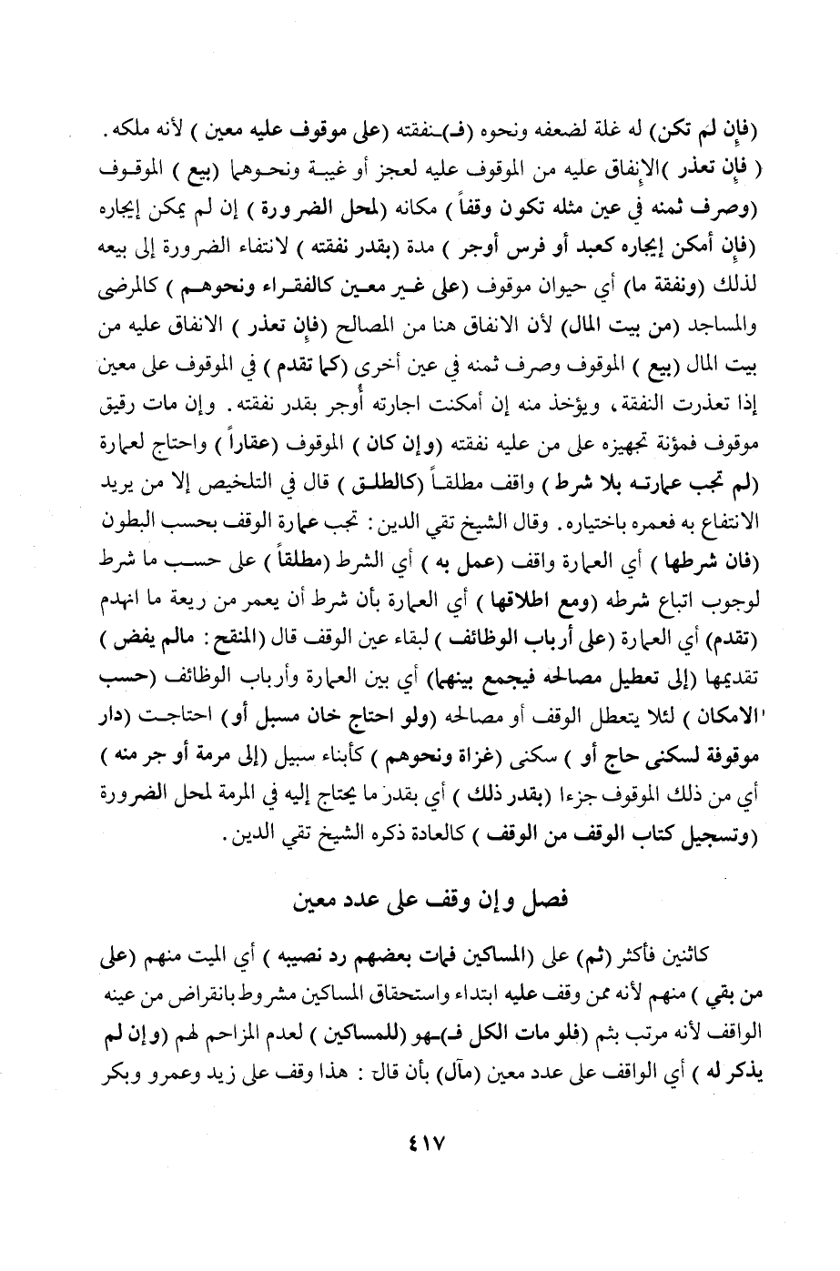(فَصْلٌ وَإِنْ وَقَفَ عَلَى عَدَدٍ مُعَيَّنٍ) كَاثْنَيْنِ فَأَكْثَرَ (ثُمَّ) عَلَى (الْمَسَاكِينِ فَمَاتَ بَعْضُهُمْ رُدَّ نَصِيبُهُ) أَيْ الْمَيِّتِ مِنْهُمْ (عَلَى مَنْ بَقِيَ) مِنْهُمْ لِأَنَّهُ مِمَّنْ وُقِفَ عَلَيْهِ ابْتِدَاءً وَاسْتِحْقَاقُ الْمَسَاكِينِ مَشْرُوطٌ بِانْقِرَاضِ مَنْ عَيَّنَهُ الْوَاقِفُ لِأَنَّهُ مُرَتَّبٌ بِثُمَّ (فَلَوْ مَاتَ الْكُلُّ فَ) هُوَ (لِلْمَسَاكِينِ) لِعَدَمِ الْمُزَاحِمِ لَهُمْ (وَإِنْ لَمْ يَذْكُرْ لَهُ) أَيْ الْوَاقِفِ عَلَى عَدَدٍ مُعَيَّنٍ (مَآلَ) بِأَنْ قَالَ: هَذَا وَقْفٌ عَلَى زَيْدٍ وَعَمْرٍ وَبَكْرٍ