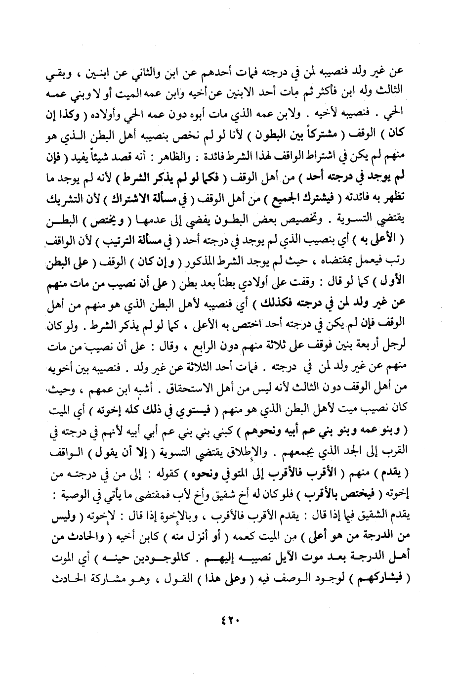 وَلَوْ كَانَ لِرَجُلٍ أَرْبَعَةُ بَنِينَ فَوَقَفَ عَلَى ثَلَاثَةٍ مِنْهُمْ دُونَ الرَّابِعِ، وَقَالَ: عَلَى أَنَّ نَصِيبَ مَنْ مَاتَ مِنْهُمْ عَنْ غَيْرِ وَلَدٍ لِمَنْ فِي دَرَجَتِهِ. فَمَاتَ أَحَدُ الثَّلَاثَةِ عَنْ غَيْرِ وَلَدٍ. فَنَصِيبُهُ بَيْنَ أَخَوَيْهِ مِنْ أَهْلِ الْوَقْفِ دُونَ الثَّالِثِ لِأَنَّهُ لَيْسَ مِنْ أَهْلِ الِاسْتِحْقَاقِ أَشْبَهَ ابْنَ عَمِّهِمْ، وَحَيْثُ كَانَ نَصِيبُ مَيِّتٍ لِأَهْلِ الْبَطْنِ الَّذِي هُوَ مِنْهُمْ (فَيَسْتَوِي فِي ذَلِكَ كُلِّهِ إخْوَتُهُ) أَيْ الْمَيِّتِ (وَبَنُو عَمِّهِ وَبَنُو بَنِي عَمِّ أَبِيهِ وَنَحْوِهِمْ) كَبَنِي بَنِي بَنِي عَمِّ أَبِي أَبِيهِ لِأَنَّهُمْ فِي دَرَجَتِهِ فِي الْقُرْبِ إلَى الْجَدِّ الَّذِي يَجْمَعُهُمْ. وَالْإِطْلَاقُ يَقْتَضِي التَّسْوِيَةَ (إلَّا أَنْ يَقُولَ) الْوَاقِفُ (يُقَدَّمُ) مِنْهُمْ (الْأَقْرَبُ فَالْأَقْرَبُ إلَى الْمُتَوَفَّى وَنَحْوِهِ) كَقَوْلِهِ: إلَى مَنْ فِي دَرَجَتِهِ مِنْ إخْوَتِهِ (فَيَخْتَصُّ بِالْأَقْرَبِ) فَلَوْ كَانَ لَهُ أَخٌ شَقِيقٌ وَأَخٌ لِأَبٍ فَمُقْتَضَى مَا يَأْتِي فِي الْوَصِيَّةِ: يُقَدَّمُ الشَّقِيقُ فِيمَا إذَا قَالَ: يُقَدَّمُ الْأَقْرَبُ فَالْأَقْرَبُ، وَبِالْإِخْوَةِ إذَا قَالَ: لِإِخْوَتِهِ (وَلَيْسَ مِنْ الدَّرَجَةِ مَنْ هُوَ أَعْلَى) مِنْ الْمَيِّتِ كَعَمِّهِ (أَوْ أَنْزَلُ مِنْهُ) كَابْنِ أَخِيهِ (وَالْحَادِثُ مِنْ أَهْلِ الدَّرَجَةِ بَعْدَ مَوْتِ الْآيِلِ نَصِيبُهُ إلَيْهِمْ. كَالْمَوْجُودِينَ حِينَهُ) أَيْ الْمَوْتِ (فَيُشَارِكُهُمْ) لِوُجُودِ الْوَصْفِ فِيهِ (وَعَلَى هَذَا) الْقَوْلِ، وَهُوَ مُشَارَكَةُ الْحَادِثِ