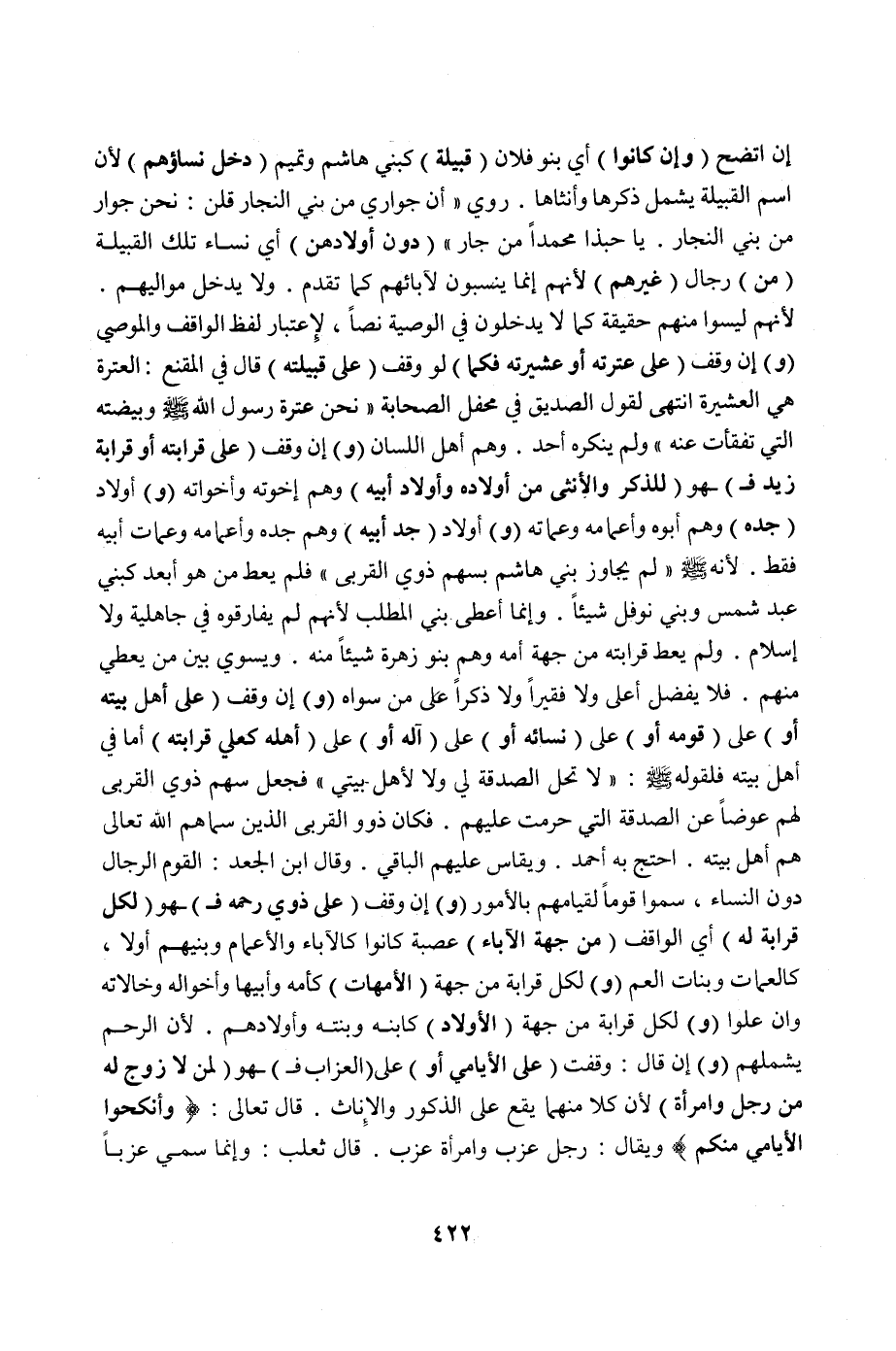 (دُونَ أَوْلَادِهِنَّ) أَيْ نِسَاءِ تِلْكَ الْقَبِيلَةِ (مِنْ) رِجَالِ (غَيْرِهِمْ) لِأَنَّهُمْ إنَّمَا يُنْسَبُونَ لِآبَائِهِمْ كَمَا تَقَدَّمَ. وَلَا يَدْخُلُ مَوَالِيهِمْ. لِأَنَّهُمْ لَيْسُوا مِنْهُمْ حَقِيقَةً كَمَا لَا يَدْخُلُونَ فِي الْوَصِيَّةِ نَصًّا، لِاعْتِبَارِ لَفْظِ الْوَاقِفِ وَالْمُوصِي (وَ) إنْ وَقَفَ (عَلَى عِتْرَتِهِ أَوْ عَشِيرَتِهِ فَكَمَا) لَوْ وَقَفَ (عَلَى قَبِيلَتِهِ) قَالَ فِي الْمُقْنِعِ: الْعِتْرَةُ هِيَ الْعَشِيرَةُ انْتَهَى لِقَوْلِ الصِّدِّيقِ فِي مَحْفِلِ الصَّحَابَةِ " نَحْنُ عِتْرَةُ رَسُولِ اللَّهِ صَلَّى اللَّهُ عَلَيْهِ وَسَلَّمَ وَبَيْضَتُهُ الَّتِي تَفَقَّأَتْ عَنْهُ " وَلَمْ يُنْكِرْهُ أَحَدٌ. وَهُمْ أَهْلُ اللِّسَانِ