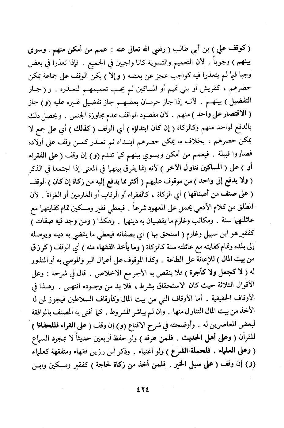 (كَوَقْفِ عَلِيِّ بْنِ أَبِي طَالِبٍ رَضِيَ اللَّهُ عَنْهُ: عَمَّمَ مَنْ أَمْكَنَ مِنْهُمْ، وَسَوَّى بَيْنَهُمْ) وُجُوبًا. لِأَنَّ التَّعْمِيمَ وَالتَّسْوِيَةَ كَانَا وَاجِبَيْنِ فِي الْجَمِيعِ. فَإِذَا تَعَذَّرَا فِي بَعْضٍ وَجَبَا فِيمَا لَمْ يَتَعَذَّرَا فِيهِ كَوَاجِبٍ عَجَزَ عَنْ بَعْضِهِ (وَإِلَّا) يَكُنِ الْوَقْفُ عَلَى جَمَاعَةٍ يُمْكِنُ حَصْرُهُمْ، كَقُرَيْشٍ أَوْ بَنِي تَمِيمٍ أَوْ الْمَسَاكِينِ لَمْ يَجِبْ تَعْمِيمُهُمْ لِتَعَذُّرِهِ. وَ (جَازَ التَّفْضِيلُ) بَيْنَهُمْ. لِأَنَّهُ إذَا جَازَ حِرْمَانُ بَعْضِهِمْ جَازَ تَفْضِيلُ غَيْرِهِ عَلَيْهِ.