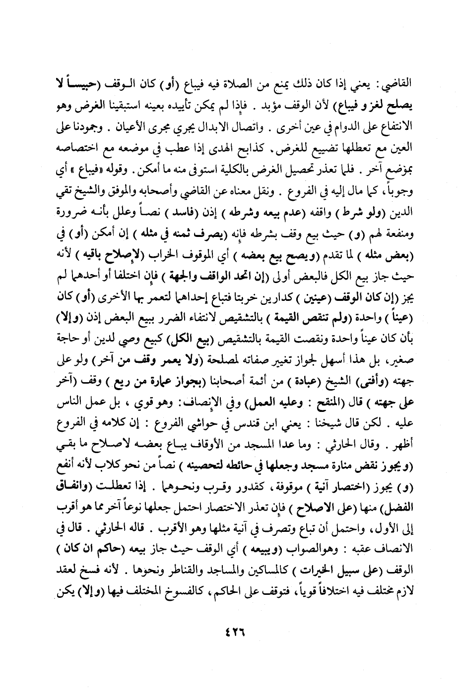 وَفِي الْإِنْصَافِ: وَهُوَ قَوِيٌّ، بَلْ عَمَلُ النَّاسِ عَلَيْهِ. لَكِنْ قَالَ شَيْخُنَا: يَعْنِي ابْنَ قُنْدُسٍ فِي حَوَاشِي الْفُرُوعِ: إنَّ كَلَامَهُ فِي الْفُرُوعِ أَظْهَرُ. وَقَالَ الْحَارِثِيُّ: وَمَا عَدَا الْمَسْجِدَ مِنْ الْأَوْقَافِ يُبَاعُ بَعْضُهُ لِإِصْلَاحِ مَا بَقِيَ (وَيَجُوزُ نَقْضُ مَنَارَةِ مَسْجِدٍ وَجَعْلُهَا فِي حَائِطِهِ لِتَحْصِينِهِ) نَصًّا مِنْ نَحْوِ كِلَابٍ لِأَنَّهُ أَنْفَعُ.